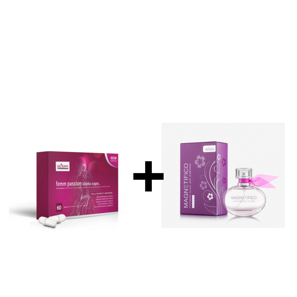 Akční balíček pro ženy – Femm Passion Libido 60 kapslí + MAGNETIFICO Pheromone Allure 50ml | Feromony pro ženy