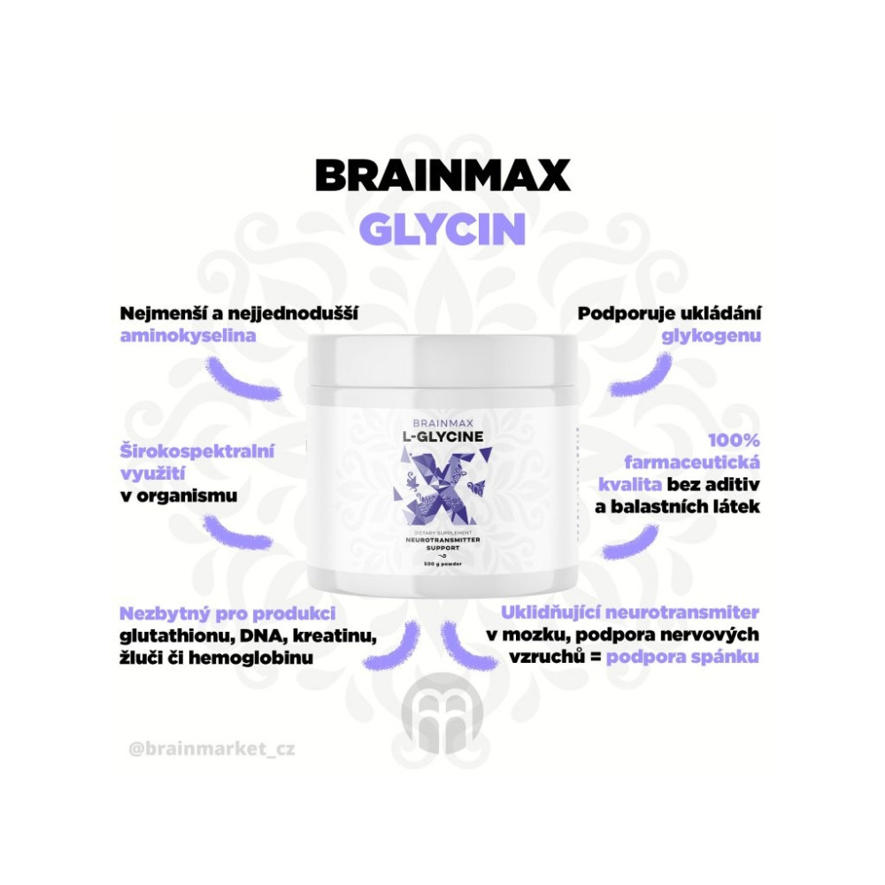 Čistý glycin bez balastu – jednoduchý doplněk, který dává smysl 💚BrainMax Glycin je 100% čistý L-glycin (farmaceutická kvalita) bez aditiv a zbytečných příměsí. Glycin je nejmenší aminokyselina, která se v těle účastní celé řady přirozených procesů – je součástí tvorby bílkovin a podílí se na tvorbě látek, jako je glutathion, kreatin, žluč, hemoglobin či DNA. V nervové soustavě glycin působí jako inhibiční (zklidňující) neurotransmiter – proto si ho spousta lidí oblíbila jako součást večerní rutiny a podpory relaxace.
