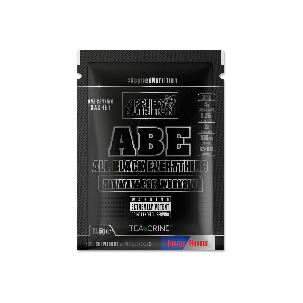 ABE je zkratkou "All Black Everything". Je to nejprodávanější evropský Pre-workout na světě, pocházející z Velké Británie. Jedná se o tvrdý pre-workout od Applied Nutrition s opravdu vysokou dávkou farmaceuticky kvalitních surovin: Citrulinu, Kreatinu, Beta alaninu, Kofeinu a Taurinu.