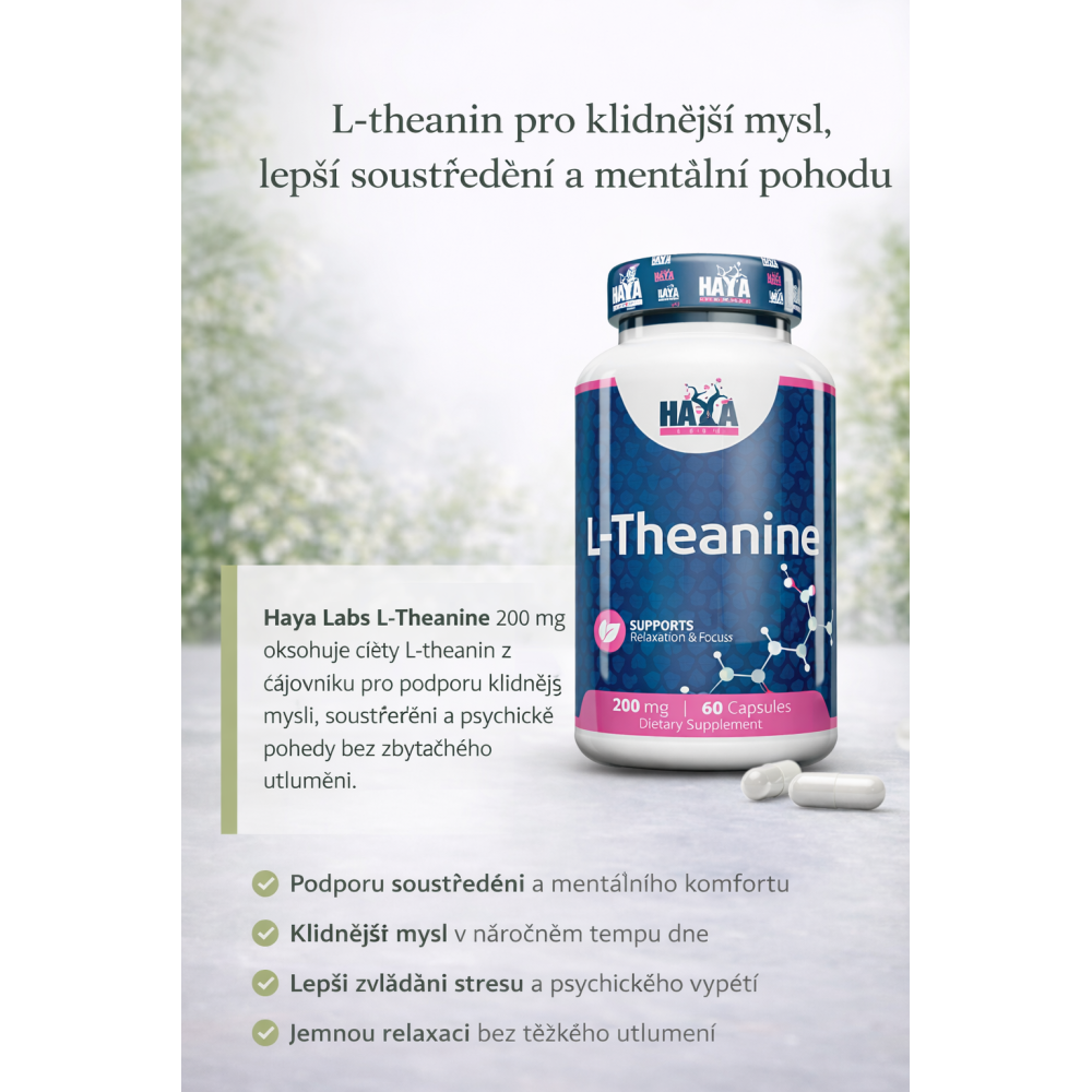Haya Labs L-Theanine 200 mg obsahuje čistý L-theanin z čajovníku pro podporu klidnější mysli, soustředění a psychické pohody bez zbytečného utlumení. L-theanin pro klidnější mysl, lepší soustředění a mentální pohodu 🌿Haya Labs L-Theanine 200 mg obsahuje vysoce čistý L-theanin – látku přirozeně se vyskytující v čajovníku (Camellia sinensis), která je oblíbená pro své jemně harmonizační působení na mysl i každodenní psychickou pohodu. Tento extrakt bývá vyhledáván všemi, kdo chtějí podpořit klidnější vnitřní nastavení, lepší koncentraci a mentální rovnováhu bez zbytečného utlumení. Produkt je vhodný pro jedince zaměřené na: