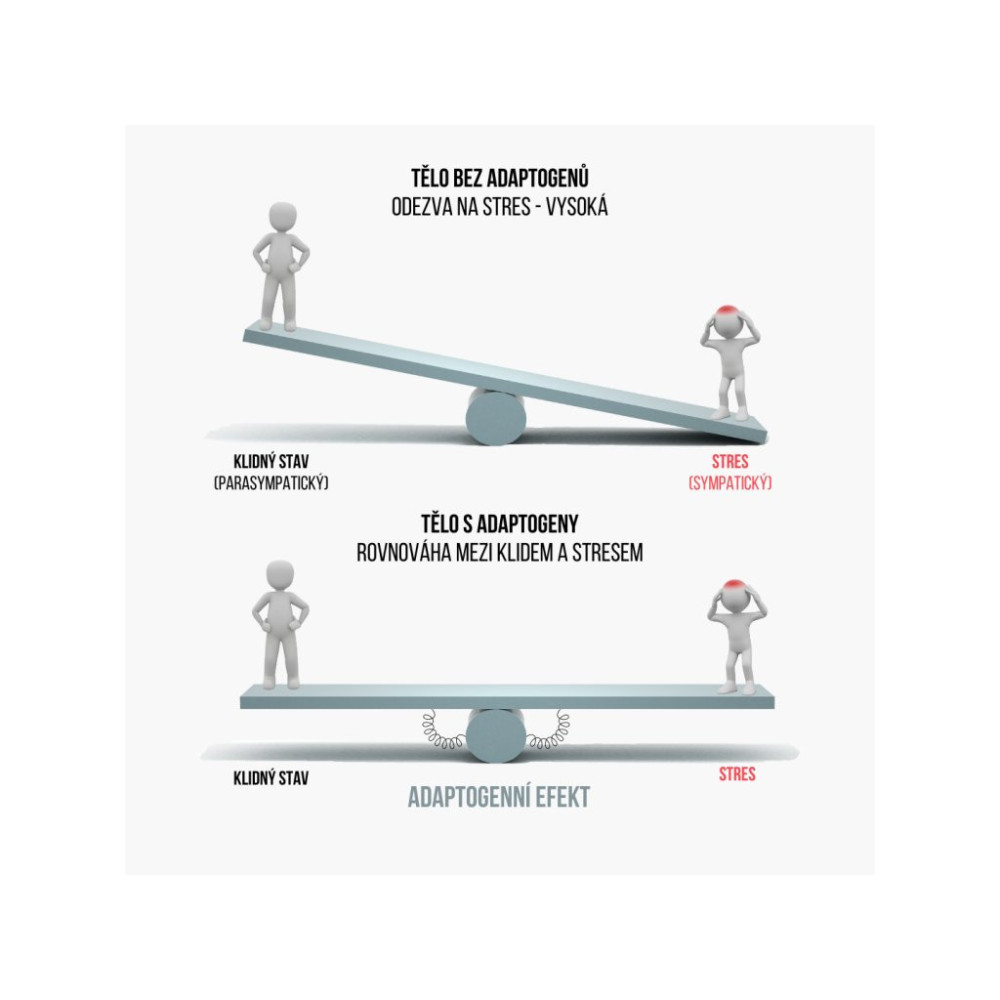 Maca jako adaptogen, je známá svou schopností pomáhat zvyšovat sílu, vytrvalost a optimalizovat hormony. Adaptogeny pomáhají zvyšovat odolnost na stres a snižovat úzkost tím, že zabraňují uvolňování stresových hormonů (CRH -> kortizol). Jinými slovy, pomáhají snižovat potřebu vašeho těla produkovat stresové hormony v reakci na stres. Nedochází tak k adrenálnímu vyčerpání a dalším negativním efektům spojeným s dopady stresu, jako jsou: úzkost, hormonální nerovnováha, ztráta libida nebo problémy se štítnou žlázou.
