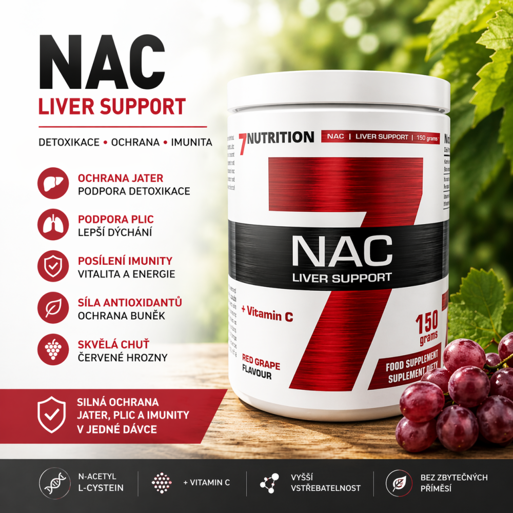 7Nutrition NAC 150 g – Červené hrozny kombinuje N-acetyl L-cystein (NAC) s vitamínem C, čímž poskytuje účinnou podporu detoxikace, imunity a buněčné ochrany. Prášková forma se snadno rozpouští a díky ovocné příchuti je jeho užívání příjemným rituálem.
