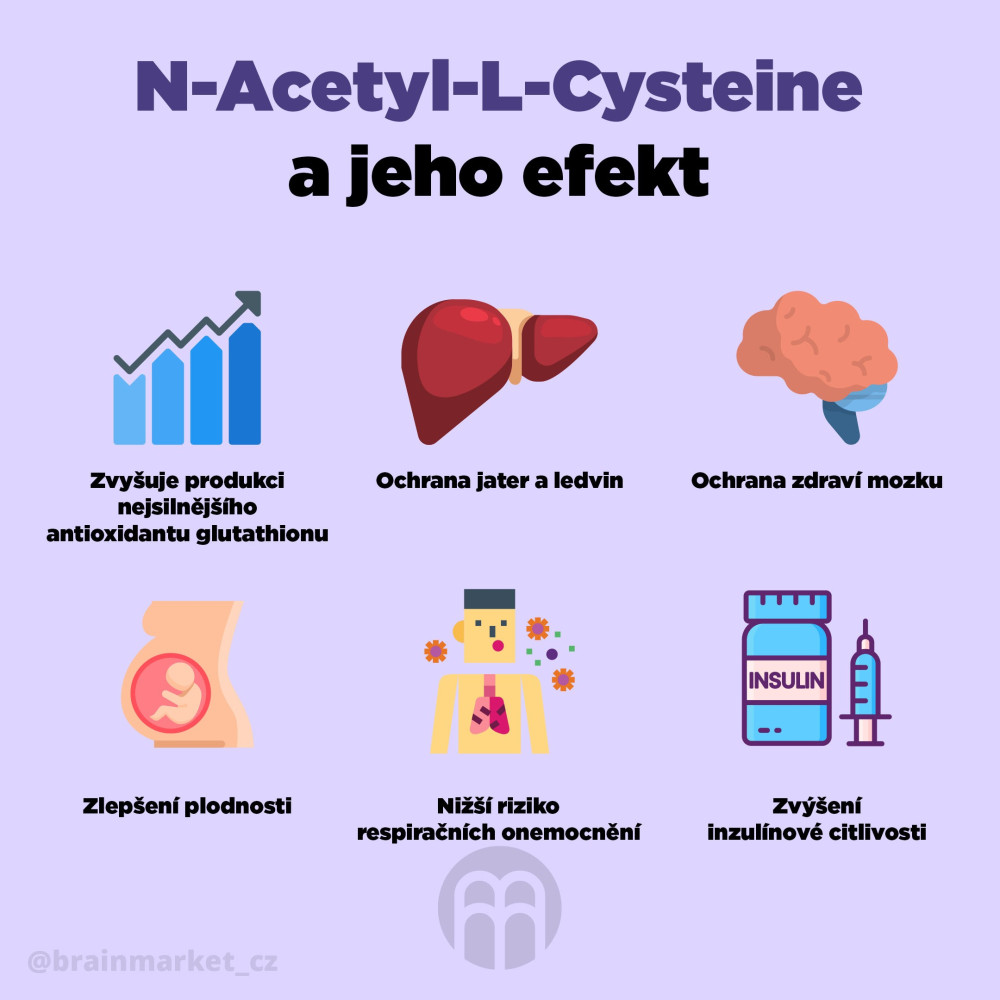 N-Acetyl-L-Cystein (NAC) je bioaktivní forma L-cysteinu – aminokyseliny, kterou si naše tělo dokáže vyrobit pouze v omezeném množství. Tato forma se v těle podílí na přirozené syntéze glutathionu, který je považován za „master antioxidant“ a hraje klíčovou roli v ochraně před oxidativním stresem a detoxikací organismu.