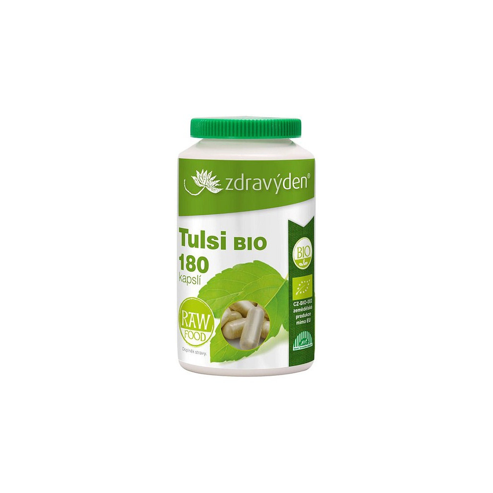 Zdravý Den Tulsi BIO 180 KapslíTulsi (bazalka posvátná), označovaná jako královna bylin, pochází z Indie a je jednou z nejposvátnějších a nejuznávanějších bylin mezi léčivými bylinami Orientu.Název Tulsí v sanskrtu znamená „ten, jemuž se nikdo nevyrovná“. Všechny části rostliny mají významné symbolické vlastnosti. BIO a RAW tulsi prášek Zdravý den® v kapslích je známá ájurvédská bylina s výraznou aromatickou a lahodnou chutí. Bazalka posvátná (Ocimum sanctum), známá jako „Tulsi“, se již po několik tisíciletí používá v systému ájurvédské medicíny.