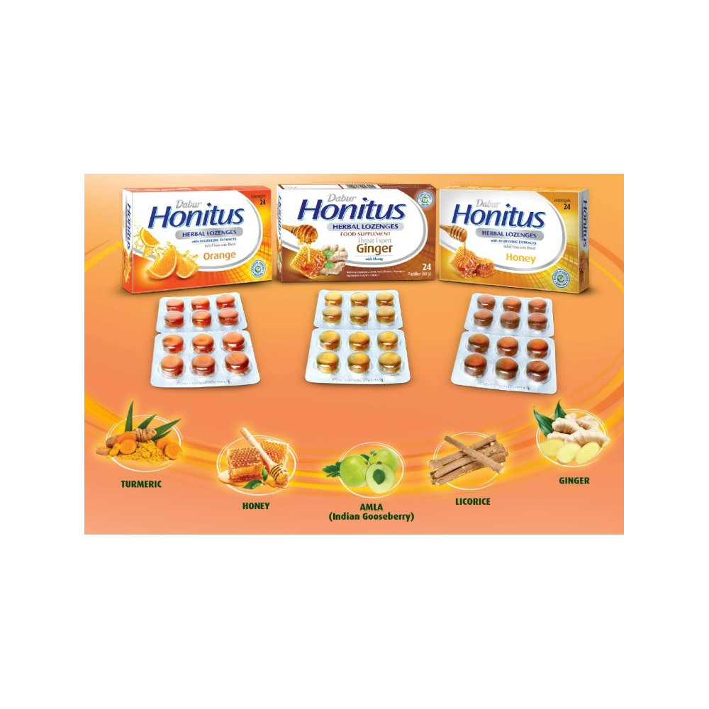 SloženíCukr, kukuřičný sirup, med, mentol, zázvorová příchuť, bylinné extrakty (amla, lékořice, zázvor, kurkuma), voda, barvivo (žlutá). Typ: doplněk stravy | Balení: 24 pastilek / 60 g | Výrobce: Dabur |