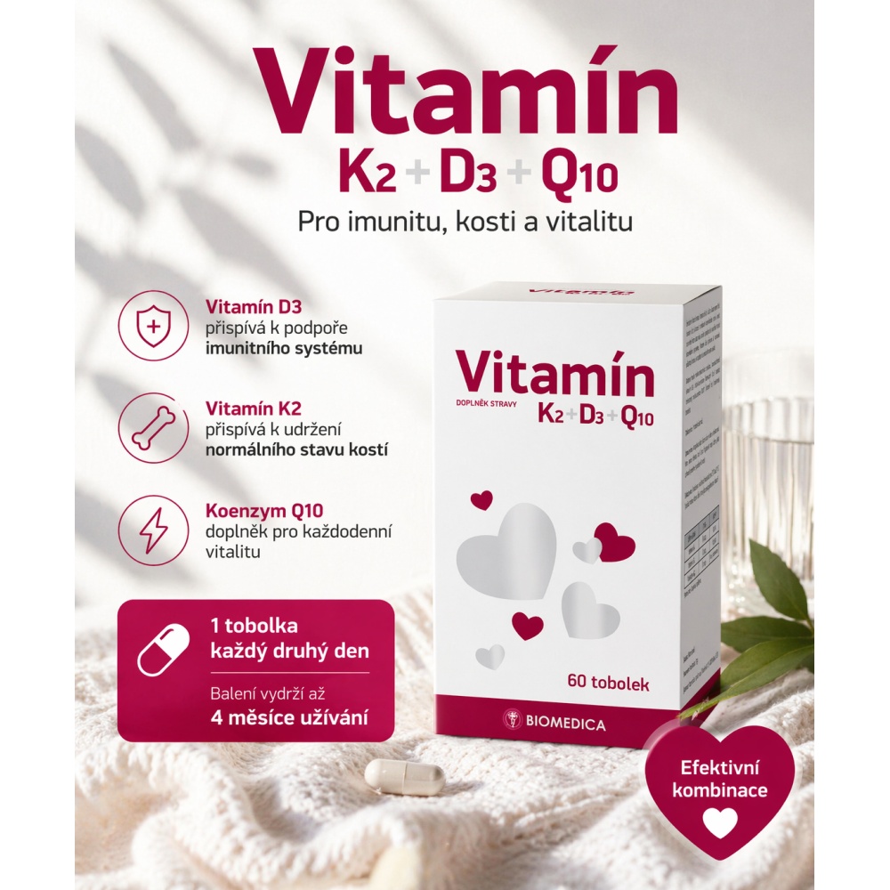 Biomedica Vitamín K2 + D3 + Q10 – promyšlená podpora kostí, imunity a vitalityBiomedica Vitamín K2 + D3 + Q10 přináší efektivní kombinaci vitaminu K2, vitaminu D3 a koenzymu Q10 v praktických tobolkách pro každodenní užívání. Jde o vhodnou volbu pro všechny, kteří chtějí podpořit normální stav kostí, imunitní systém a správné využití vápníku v organismu. Praktické dávkování: pouze 1 tobolka každý druhý den – balení vydrží až 4 měsíce pravidelného užívání. Vitamin D3 přispívá k normální funkci imunitního systému a k normálnímu vstřebávání a využití vápníku a fosforu. Vitamin K přispívá k udržení normálního stavu kostí. Koenzym Q10 doplňuje recepturu produktu a dělá z něj zajímavou součást každodenní péče o vitalitu. Pro koho je Biomedica K2 + D3 + Q10 vhodný?