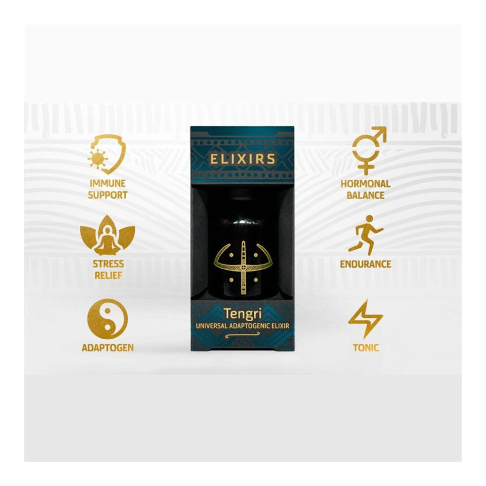 "Adaptogenní elixír TENGRI je inspirován bohem Nebe - stvořitelem a dobyvatelem, symbolem dávající a transformující síly. Jeho symbolem je runa, se kterou šamani zobrazovali boha Tengri.