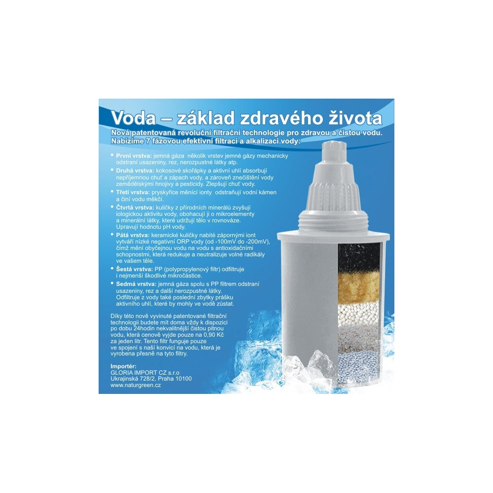 Alkalický vodní filtr – náhradní náplň je určena pro konvici Naturgreen® a přináší sedmistupňovou filtraci pro maximální čistotu a kvalitu vaší vody. Odstraňuje chlor, těžké kovy, nečistoty a pachutě, zároveň obohacuje vodu o minerály, zvyšuje pH a upravuje ORP do mírně záporných hodnot.