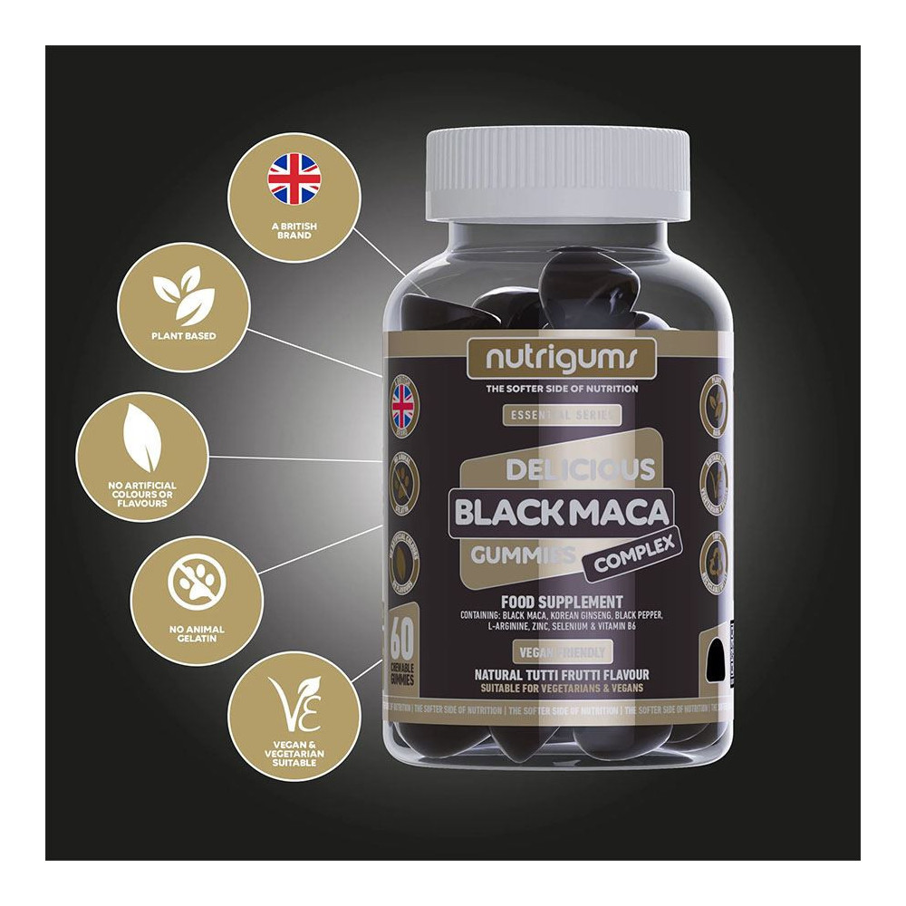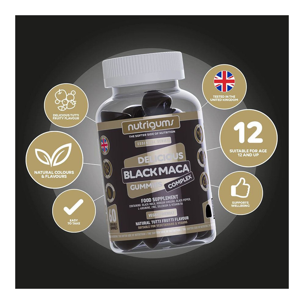 Vitamínová želé nemusí být plná umělých sladidel a barviv! Želé Nutrigums® Black Maca má lahodnou příchuť tutti frutti a lehce se konzumuje. Tělu dodává všechny benefity černé macy, korejského ženšenu, selenu, zinku a vitamínu B6. Tyto složky mají synergický účinek a podporují vitalitu, hladinu energie a přirozenou produkci testosteronu.