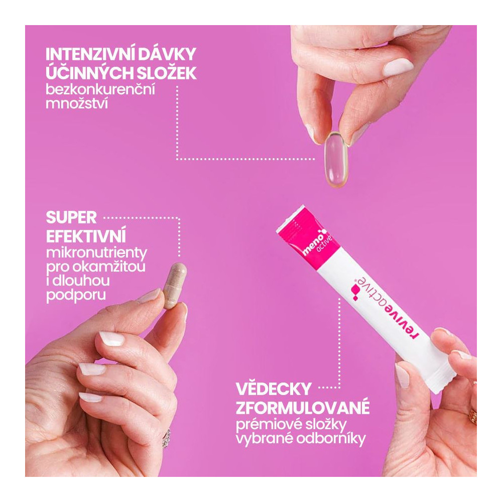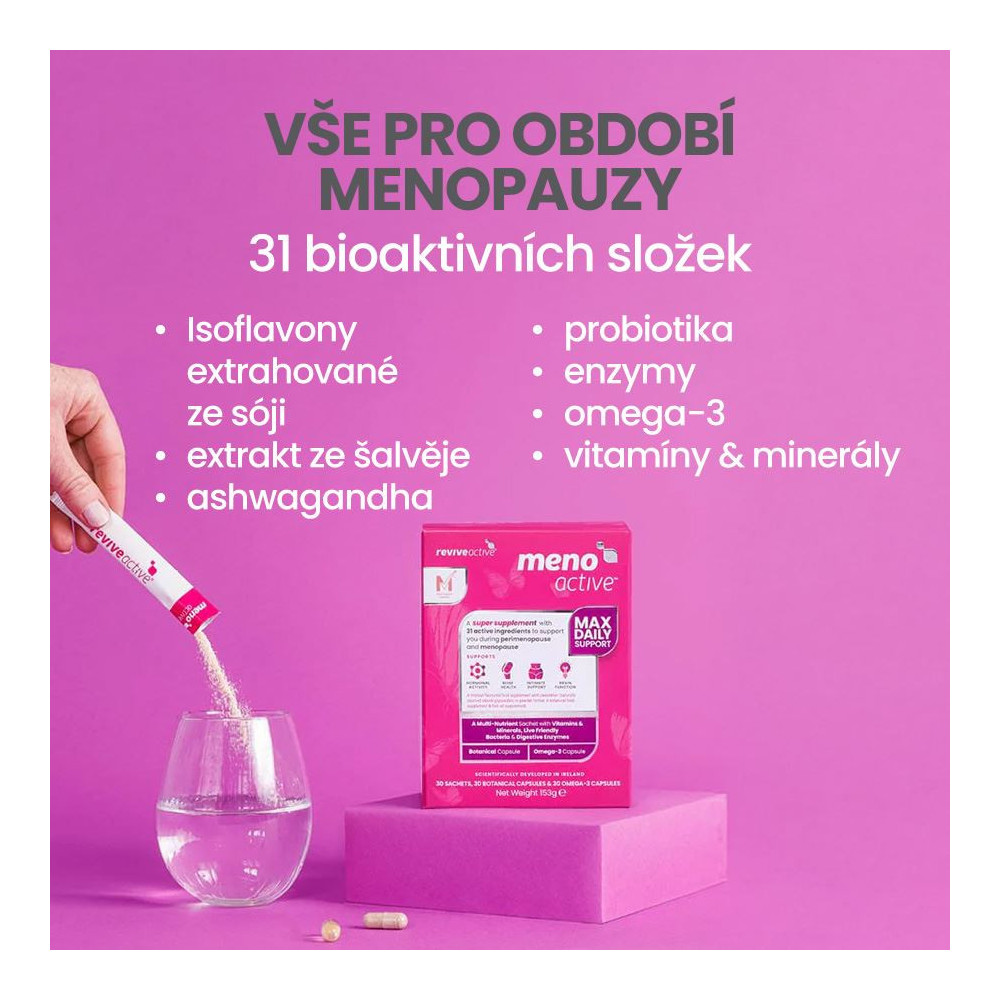 Meno Active je sestavený speciálně pro všechny ženy procházející náročným obdobím menopauzy. Obsahuje celkem 31 (!) bioaktivních složek (v sáčku, rostlinných kapslích a speciálních rostlinných enterických kapslích) pokrývajících všechny hlavní oblasti (fyzické i psychické) spojené s menopauzou. Meno Active poskytuje podporu pro oblast hormonů, intimní oblast, nervovou soustavu, mozek, kosti, srdce, energii, tvorbu kolagenu, hladinu krevní glukózy a mikrobiomu.
