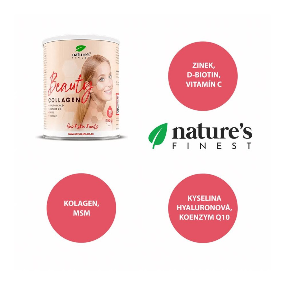 Nature's Finest Beauty Collagen je pečlivě sestavená směs 7 účinných složek pro podporu stavu pleti, vlasů a nehtů. Spojuje kolagen, MSM a kyselinu hyaluronovou s beauty mikronutrienty – koenzymem Q10, D-biotinem, zinkem a vitaminem C, který přispívá k normální tvorbě kolagenu pro správnou funkci pokožky.