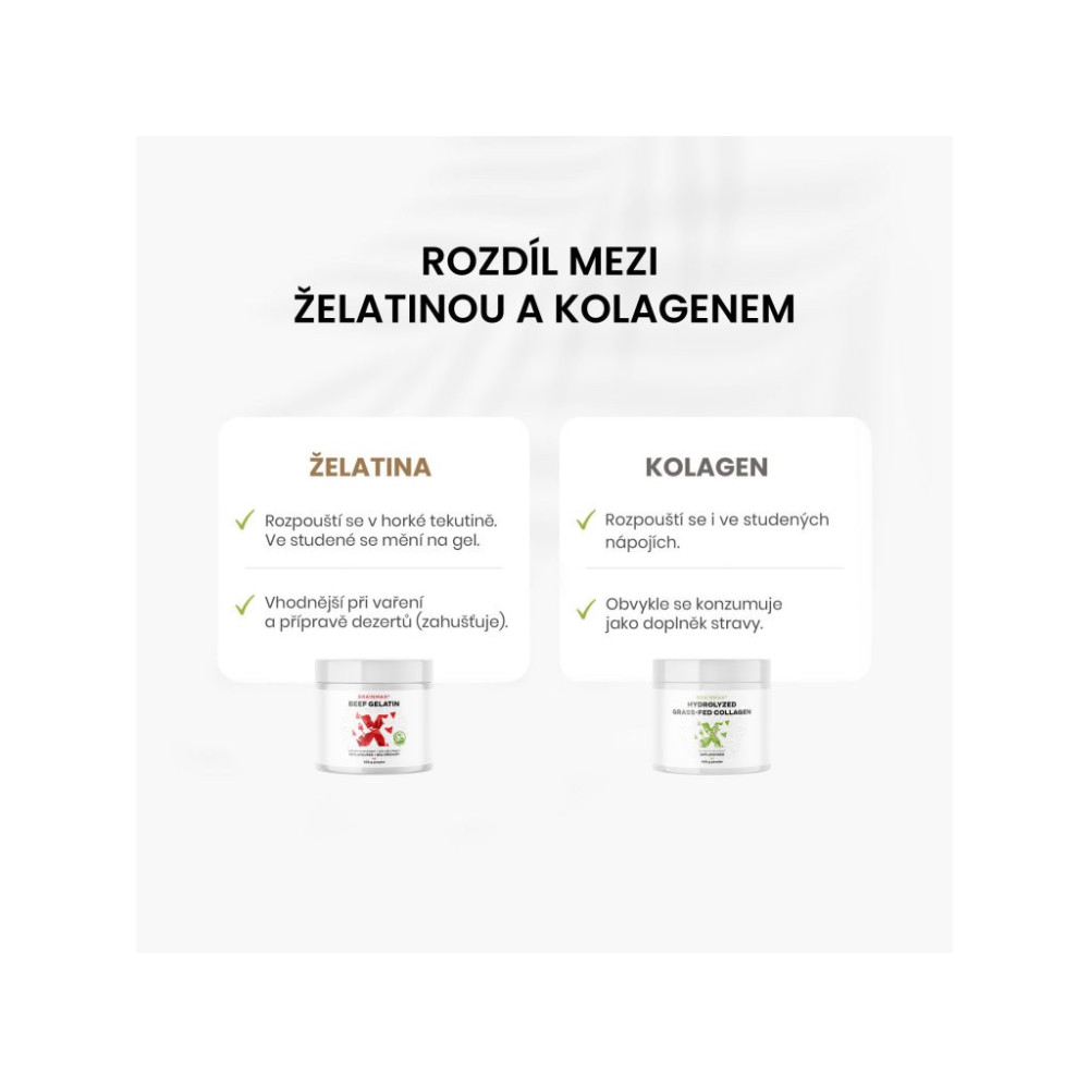 Kolagen a želatina jsou si dost podobné. Obě složky obsahují aminokyseliny glycin, prolin a hydroxyprolin, které přispívají ke zdraví kostí, kloubů, elasticitě pokožky a střevní výstelky, která lemuje naše střeva zevnitř a tvoří bariéru, přes kterou se v ideálním případě mohou dostat jen živiny a vitamíny. Hlavní rozdíl je ve způsobech jejich použití. Narozdíl od kolagenu se želatina rozpouští v horkých tekutinách, ale ve studených tekutinách nebo po vychladnutí zgelovatí nebo zhoustne. Při zahřátí mění svou strukturu a tak může být součástí nejrůznějších pokrmů. Využijete ji např. pro přípravu různých ovocných želé, cukrovinek, dortů, gumových bonbónů, marmelád, zahuštění omáček či polévek, nebo si ji můžete jen tak přidat do kávy nebo čaje.