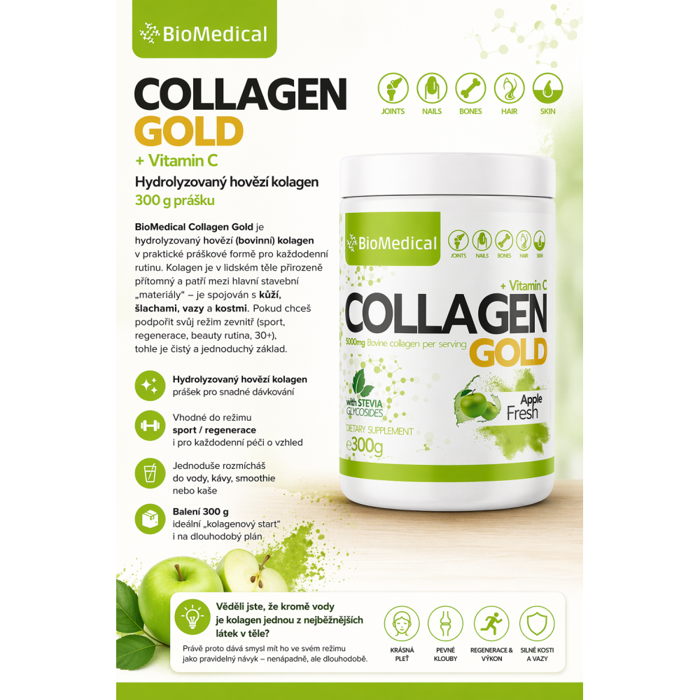 BioMedical Collagen Gold – Hydrolyzovaný kolagen 300 gCollagen Gold je hydrolyzovaný hovězí kolagen (kolagenový hydrolyzát, kolagenový peptid) od renomovaného německého výrobce. Věděli jste, že kromě vody je kolagen jako nejběžnější látka v našem těle a stavební kámen pro kůži, šlachy a kosti?