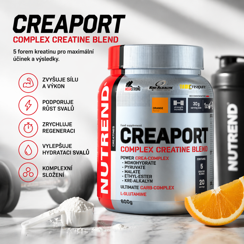 Nutrend CREAPORT pomeranč 600 g je promyšlená potréninková formule pro sportovce, kteří chtějí podpořit obnovu energie, regeneraci a návrat do výkonu po náročné fyzické aktivitě. Kombinuje 3 různé formy kreatinu s optimální dávkou sacharidů v dobře rozpustné instantní směsi.