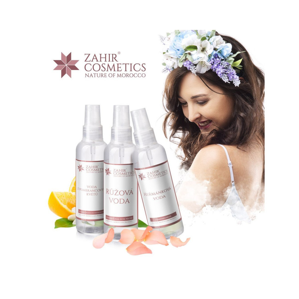 ZAHIR Růžová voda s rozprašovačem je 100% přírodní květová voda vhodná pro všechny typy pleti – včetně citlivé, zánětlivé i zralé. Díky svému jemnému složení pleť zklidňuje, tonizuje a připravuje ji na aplikaci olejů či krémů.
