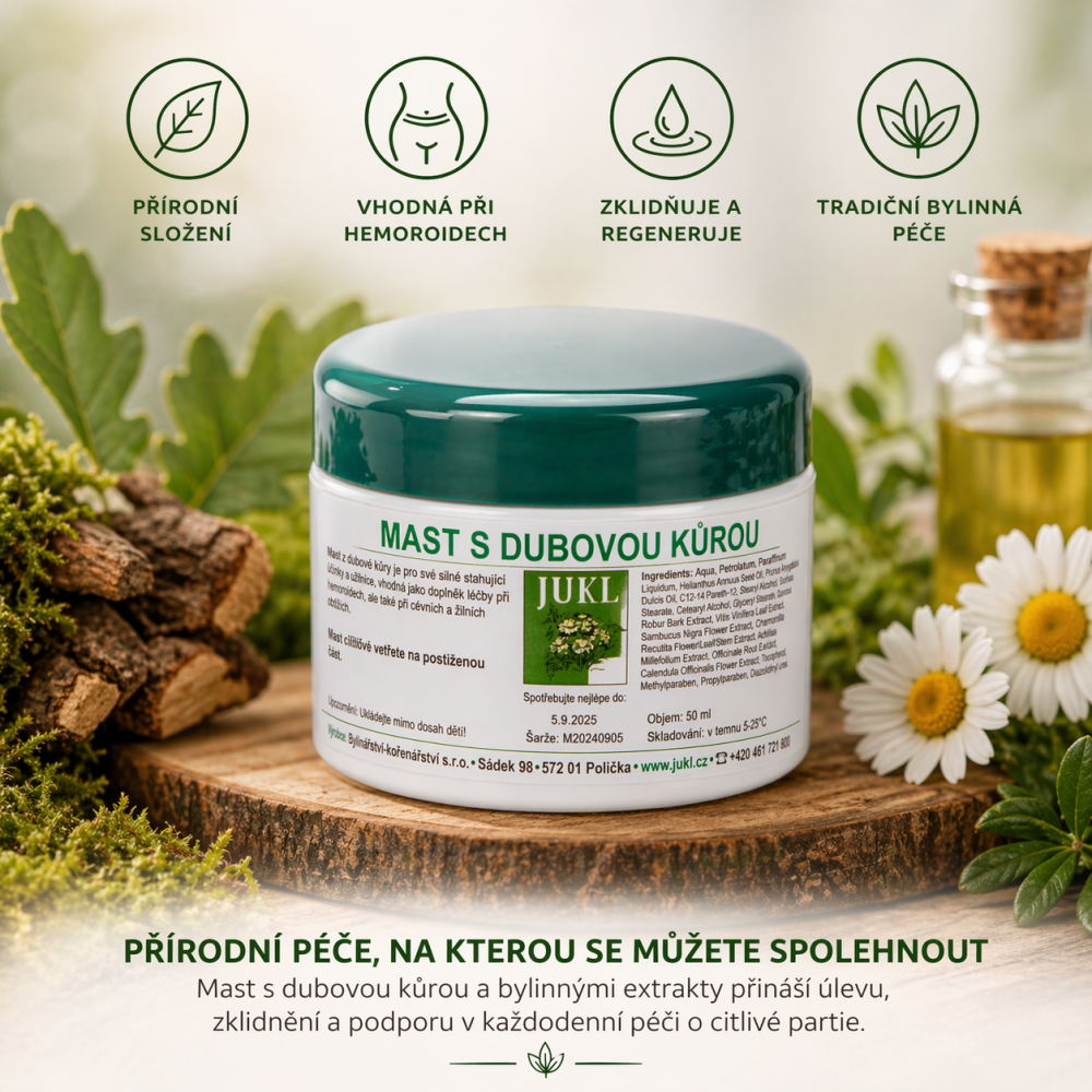 Výrobce Jukl přejmenoval původní Mast na hemoroidy na Mast s dubovou kůrou. Složení i způsob použití zůstávají stejné, mění se pouze název. Mast je určená k cílené péči o citlivou pokožku v okolí konečníku a žilních oblastí, kde napomáhá ke zklidnění a pocitu většího komfortu.