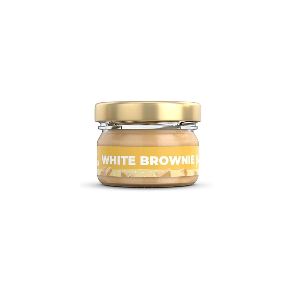 Příchuť white brownie - jemný ořechový krém s bílou čokoládou: lískové ořechy 30 %, kešu ořechy 25 %, sušené mléko, bílá čokoláda 15 % (cukr, kakaové máslo, sušené mléko, sušená syrovátka, emulgátor sójový lecitin, vanilkový extrakt), kokosový cukr, GHÍ (máselný tuk). Může obsahovat stopy i jiných druhů ořechů a arašídů.