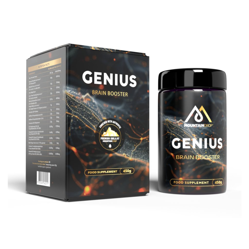 🧠 MOUNTAINDROP® GENIUS Brain Booster 450 gKomplexní směs 17 pečlivě vybraných přírodních složek, navržená jako součást denního režimu zaměřeného na soustředění, paměť a mentální energii.
