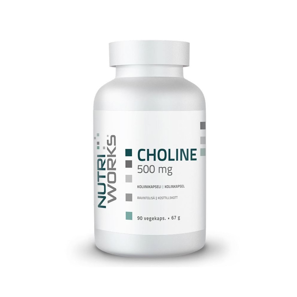 NutriWorks Choline 500 mg – doplněk stravy s cholin-bitartrátem, denní dávka 500 mg cholinu (2 kapsle), 90 kapslí / 45 dávek, pro každodenní mentální režim a podporu metabolismu lipidů a činnosti jater.
