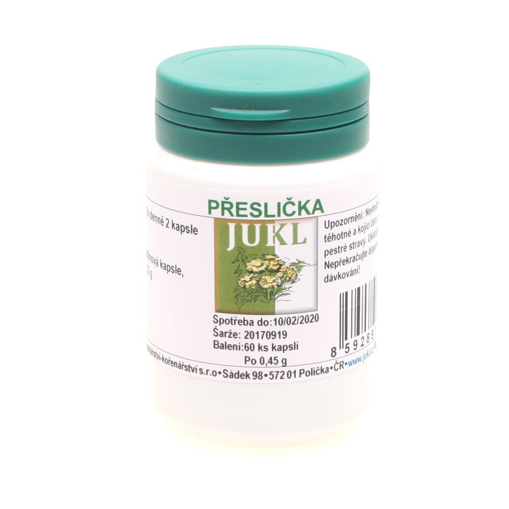 Jukl Přeslička 60 kapslí – bylinný doplněk s přesličkou rolní (Equisetum arvense) pro podporu vylučování a přirozený přísun křemíku v každodenním režimu.