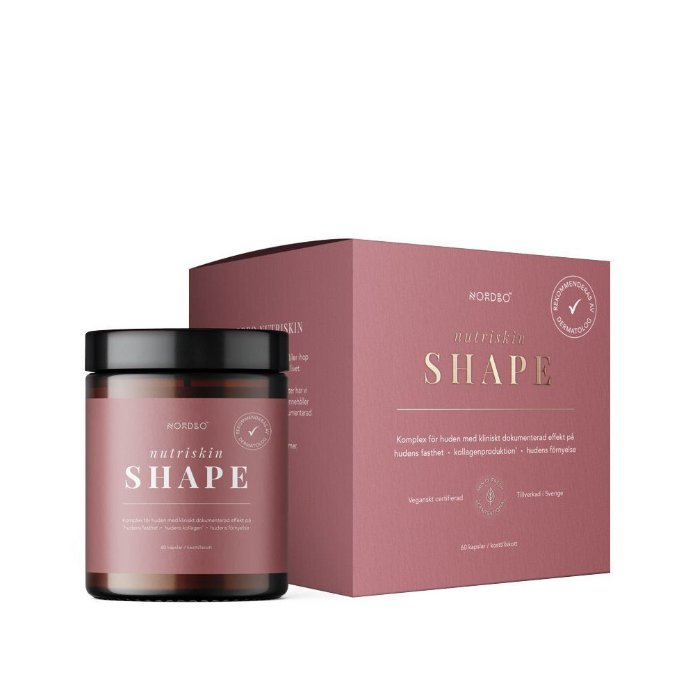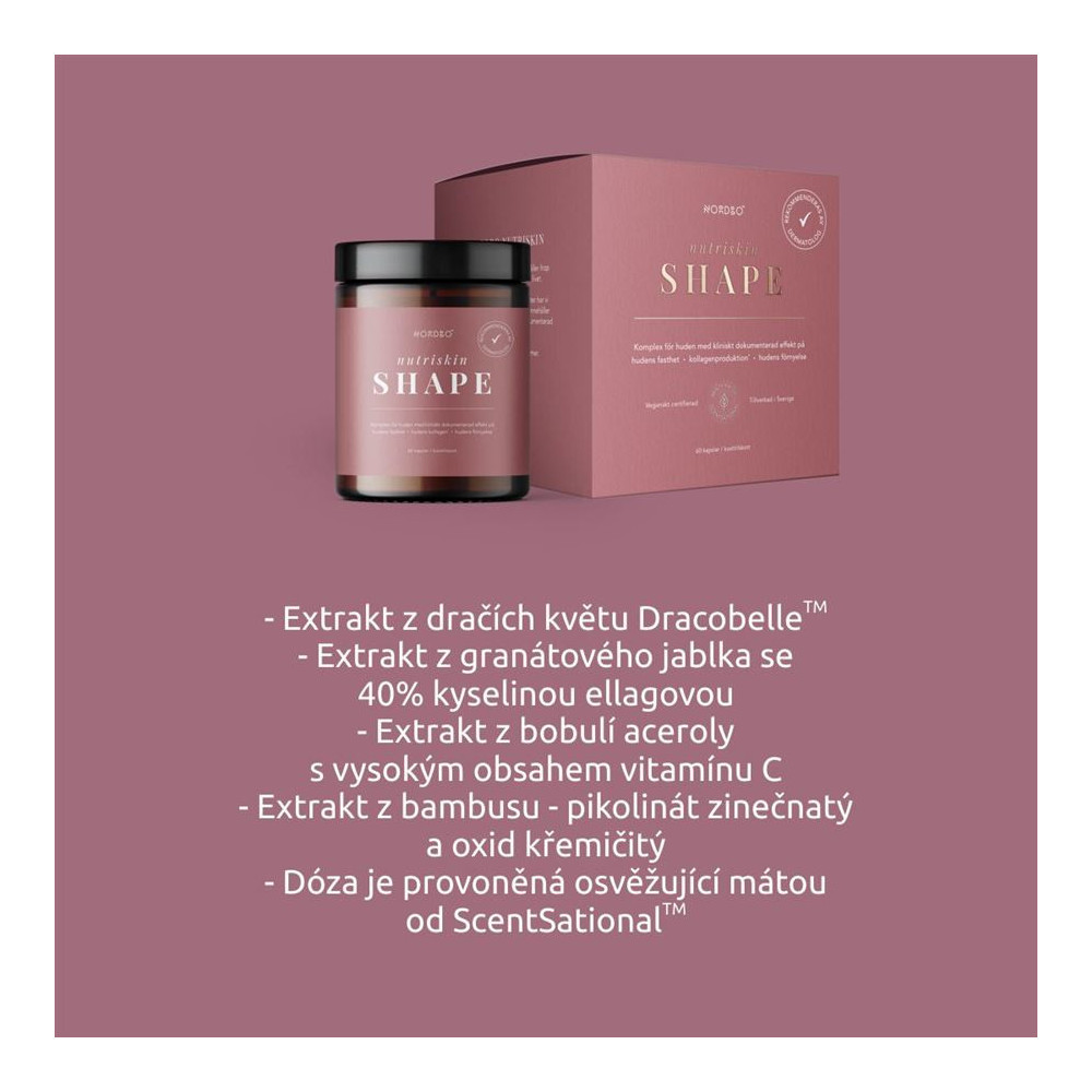 Nutriskin Shape je přírodní kapslový doplněk pro podporu pevnosti pleti. Nutriskin obsahuje výhradně účinné přírodní složky – unikátní přírodní extrakty zaměřené na podporu tvorby kolagenu, regeneraci a oxidativní stres. Extrakt z včelníku DracoBelleTM obdržel cenu Nutra Ingredients Asia za nejlepší složku roku 2022 v kategorii Beauty from Within. DracoBelleTM aktivuje signální dráhu AMPK/FOXO s vlastnostmi souvisejícími s tvorbou extracelulární matrix, množstvím kolagenu a kondicí pokožky. Kyselina ellagová a pikolinát zinečnatý (zinek) mají vlastnosti související s oxidativním stresem, zatímco extrakt z aceroly s vysokým obsahem vitamínu C a oxid křemičitý (křemík) podporují tvorbu kolagenu.