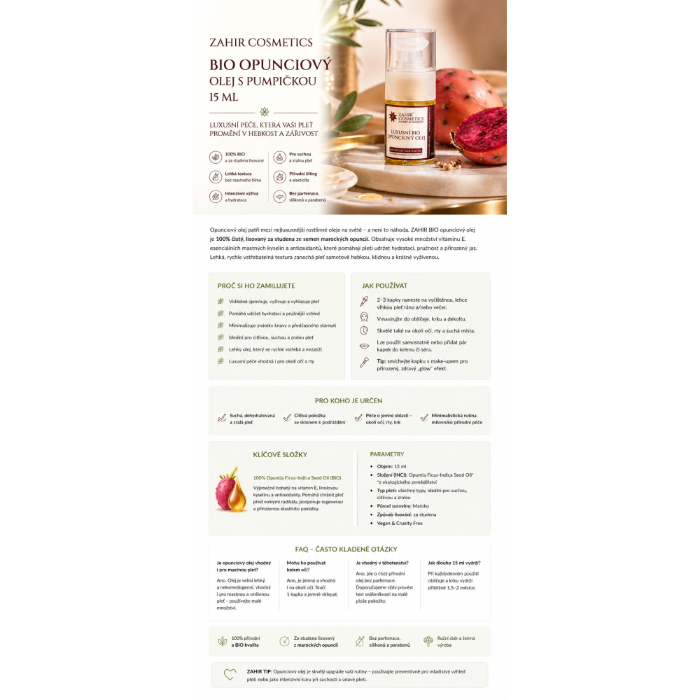 Zahir BIO Opunciový olej patří mezi nejcennější pleťové oleje přírodní kosmetiky. Lisuje se za studena ze semen marocké opuncie a je oblíbený pro svůj luxusní pocit na pleti, lehkou texturu a vysoký obsah přirozených lipidů.