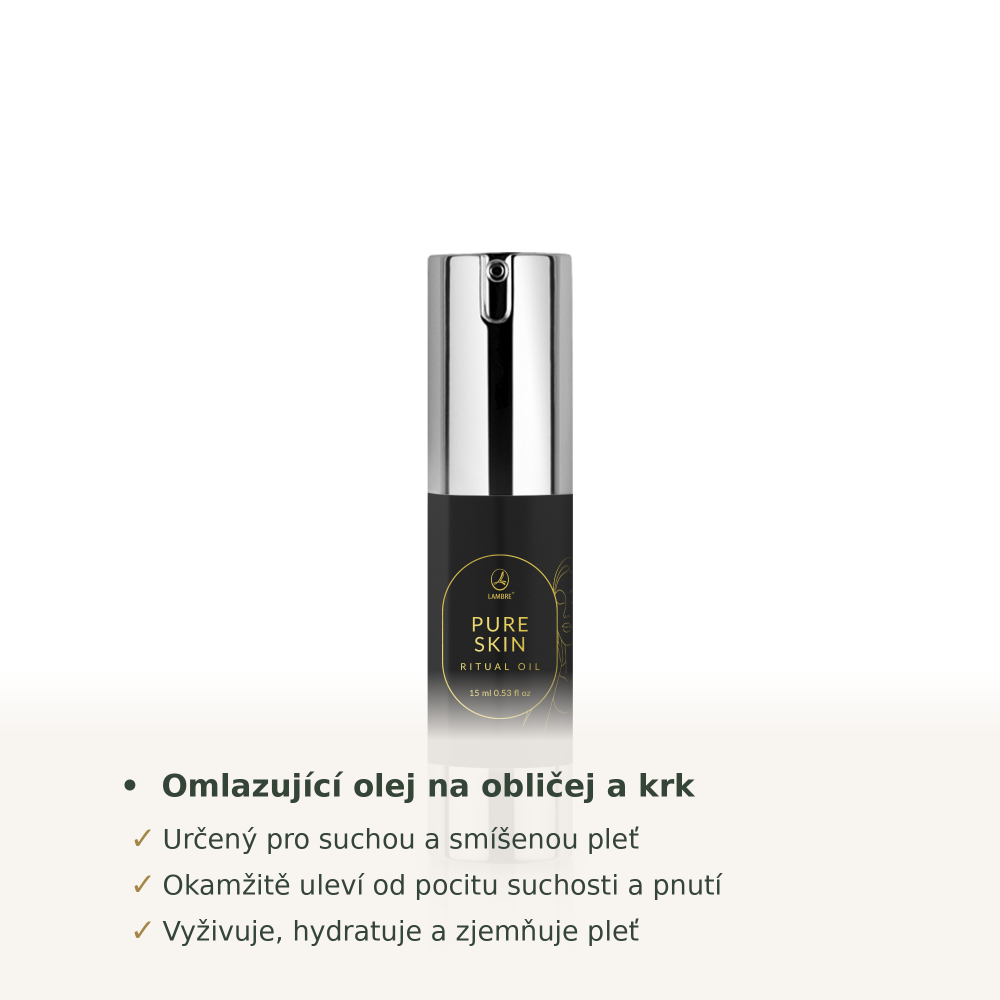 Co olej dělá s pletí (a proč ho lidé milují)Omlazující olej na obličej a krk je postavený na kombinaci 6 vzácných olejů a vitaminu E. Pomáhá pleti působit vyživeně, pružně a hladce, zároveň přináší okamžitý komfort – typicky mizí pocit suchosti a stažení. Díky tomu, že je přípravek biokompatibilní s pokožkou (obsahuje látky přirozeně se vyskytující v epidermis), podporuje rovnováhu hydrolipidového filmu a přirozené funkce pokožky. Hlavní benefity, které uvidíš a ucítíš