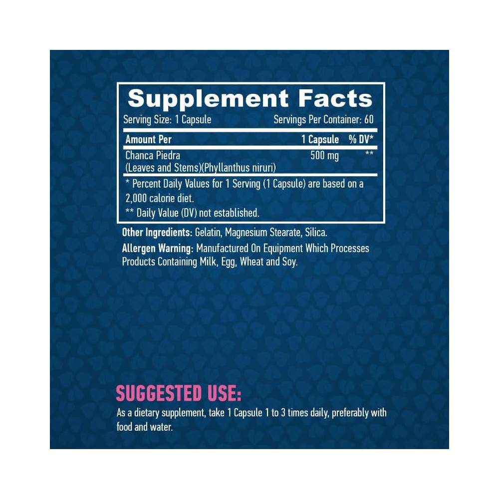 🌱 SloženíChanca Piedra (lístky a stonky) (Phyllanthus niruri) 500 mg, želatina, stearan hořečnatý, oxid křemičitý. ⚠️ Upozornění
