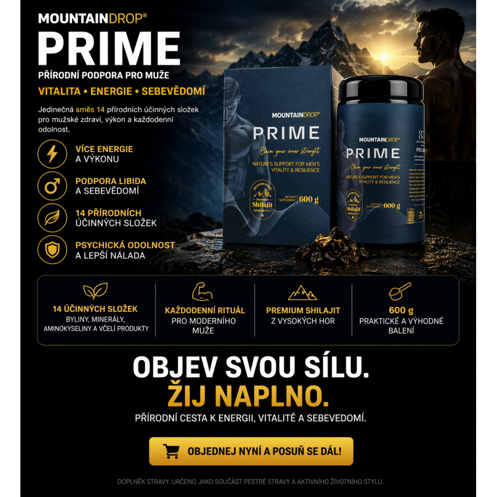 Přírodní podpora mužské vitality a odolnosti. Mountaindrop PRIME je jedinečná směs 14 přírodních účinných složek pro podporu mužského zdraví. Pomáhá udržovat energii, sebevědomí a libido, podporuje lepší náladu a navrací radost ze života. Muži jej často volí v obdobích fyzické i psychické zátěže, kdy chtějí tělu dodat přirozenou podporu.