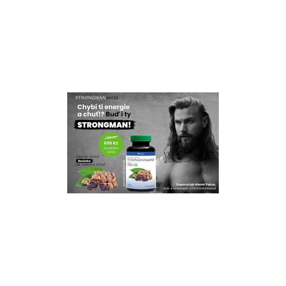 Originál obsahující byliny a plodiny pěstované na plantážích v jižní Asii, v současnosti dostupný pouze u nás! 100% garance kvality. Nejvýše zastoupenými složkami STRONGMANworld jsou Kaempferia Parviflora, Astragalus membranaceus a Panax ginseng. Hlavní složka Kaempferia Parviflora (Zázvor černý) je přirozeným antioxidantem. Astragalus membranaceus (Kozinec blanitý) výrazně podporuje imunitní systém, normální činnost cévní soustavy, ledvin a močového měchýře, přispívá ke zvýšeni pohyblivosti kloubů a pomáhá normalizovat hladinu cukru v krvi. Panax ginseng (Ženšen pravý) působí příznivě při fyzickém výkonu. Přispívá ke snížení únavy, normální funkci kardiovaskulárního systému a udržuje sexuální zdraví, vitalitu a paměť.