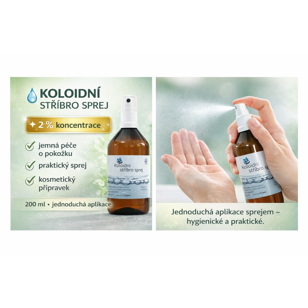 Přípravek s obsahem stříbrných částic ve vodném roztoku. Forma spreje je ideální tam, kde chcete rychlou, pohodlnou a čistou aplikaci bez zbytečné manipulace. Větší balení 200 ml se hodí zejména pro pravidelné domácí používání.