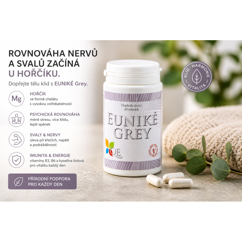 EUNIKÉ Grey je přírodní doplněk stravy s vysokým obsahem hořčíku ve formě chelátu, který se výborně vstřebává, a dále vitamínů B3 (niacin), B6 a kyseliny listové. Je ideální volbou pro každého, kdo trpí svalovými křečemi, tetanií, nespavostí, nervozitou, stresem či chronickým vyčerpáním.