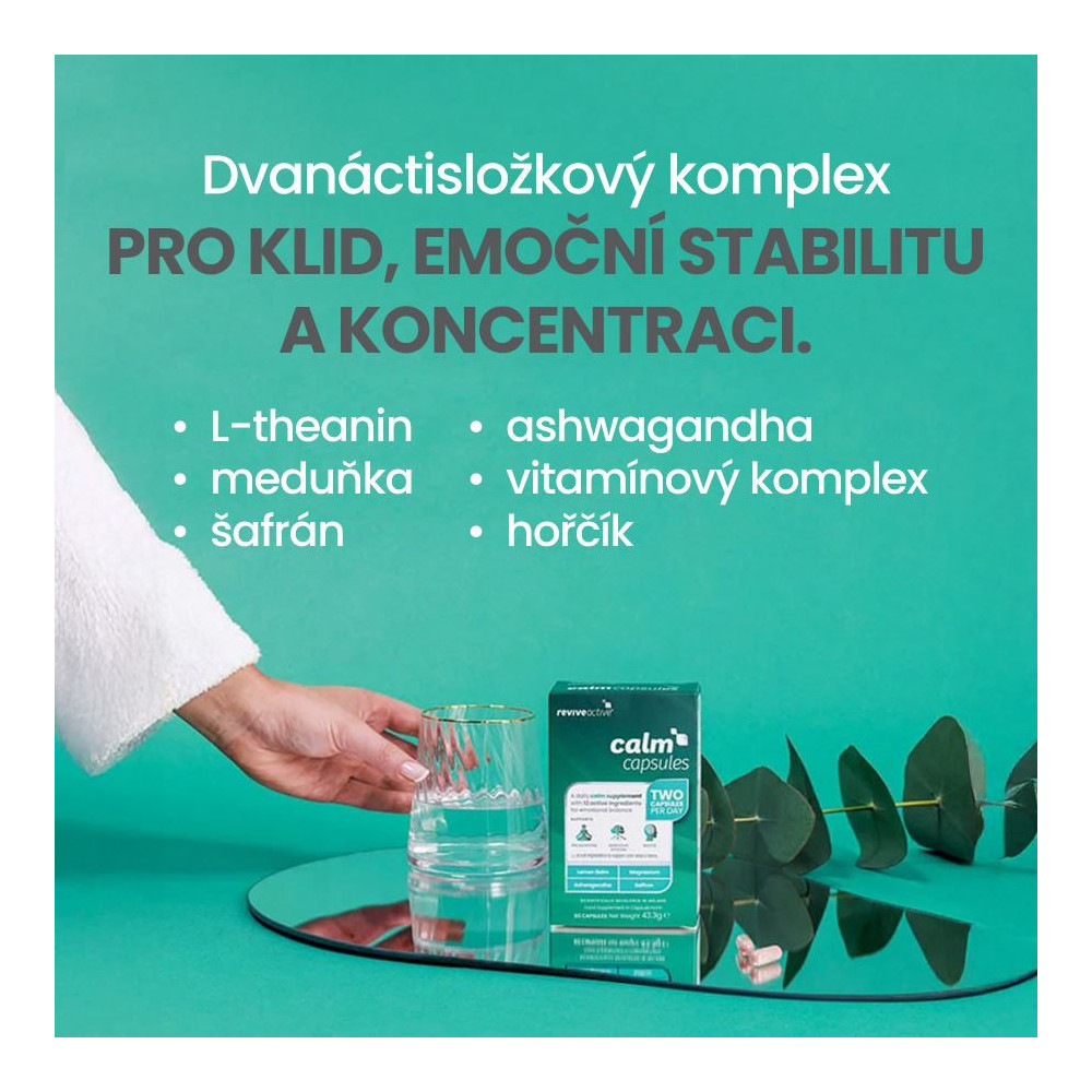 Calm obsahuje L-theanin a extrakt z listů meduňky pro okamžitý účinek (během hodiny), extrakt z květů šafránů a extrakt z kořene ashwagandhy pro dlouhodobý účinek. Calm dále obsahuje B komplex s obsahem bioaktivního koenzymu vitamínu B2, kyselina listovou ve formě bioaktivního folátu a hořčík v organické formě bisglycinátu hořečnatého. Vitamíny a hořčík účinkují střednědobě až dlouhodobě. To vše bez obsahu nežádoucích a balastních aditiv v každé kapslí!