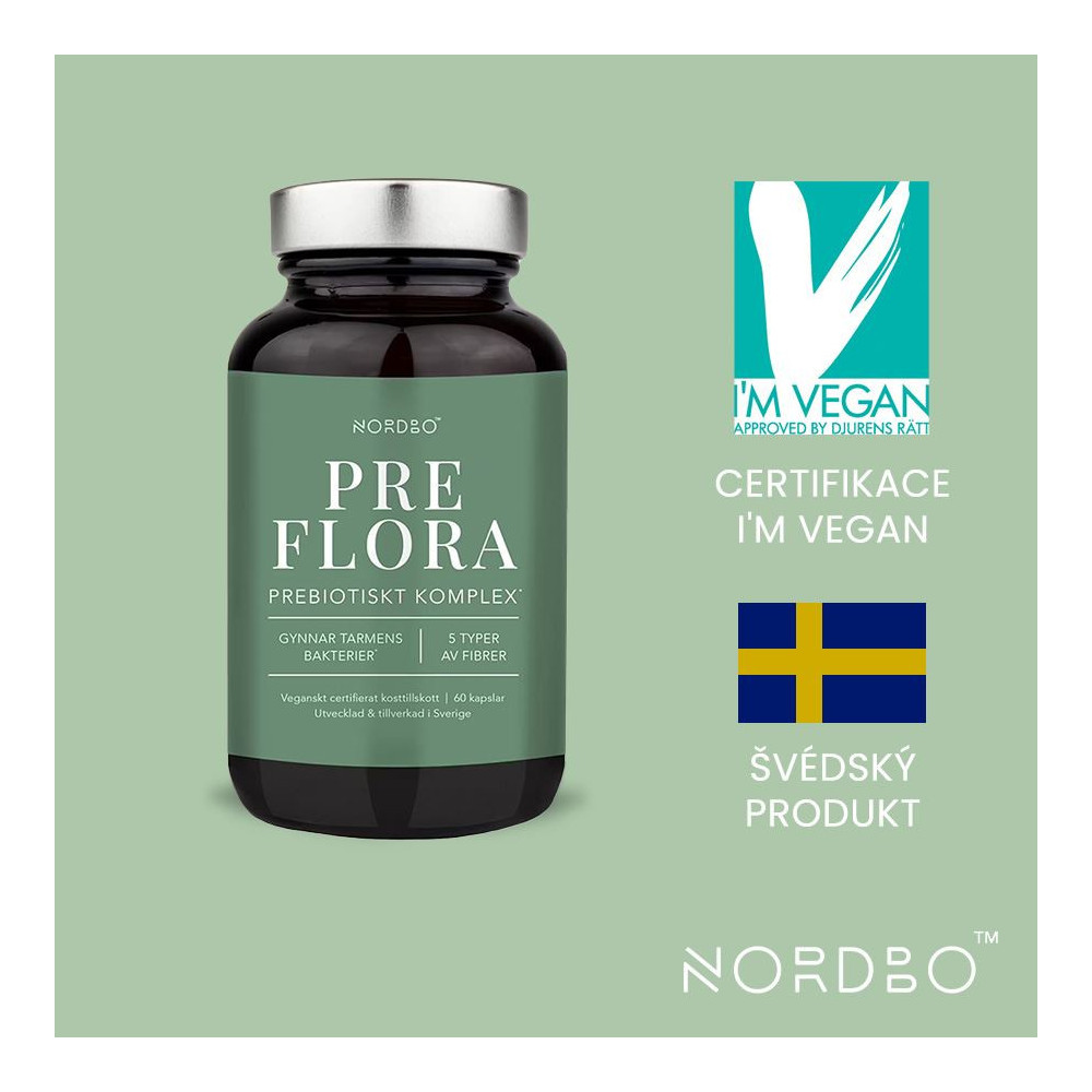 Nordbo PreFlora obsahuje 5 druhů prebiotik – ResistAid™ (arabinogalaktan z modřínu), inulin, rezistentní škrob, pektin a fruktooligosacharidy. Účinek složky ResistAid™ byl podpořen třemi klinickými studiemi (dle výrobce). Tyto látky fungují dvojím způsobem – stimulují činnost žaludku a ve střevě tvoří výživu pro prospěšné biokultury. Proto je vhodné doplněk PreFlora užívat společně s produkty Lacti Total nebo Lacti Kvinna. Produkt je vhodný pro všechny jedince zaměřené na podporu zažívacího traktu a podporu optimální činnosti živých bakterií střevní mikroflóry. Certifikace I’m VeganCertifikát I’m Vegan uděluje švédská organizace Djurens Rätt (Animal Rights). Garantuje, že produkt je 100% rostlinného původu, při výrobě nebyly použity živočišné složky a je zakázáno testování na zvířatech (dle výrobce). O značce NORDBO (výrobce)NORDBO je švédská značka založená na kvalitě a klinické dokumentaci + udržitelnosti a etické odpovědnosti. Produkty jsou vyrobené dle standardů GMP, obaly z recyklovaných materiálů (FSC). Produkty mají certifikace ASC nebo I’m Vegan (dle produktu). |