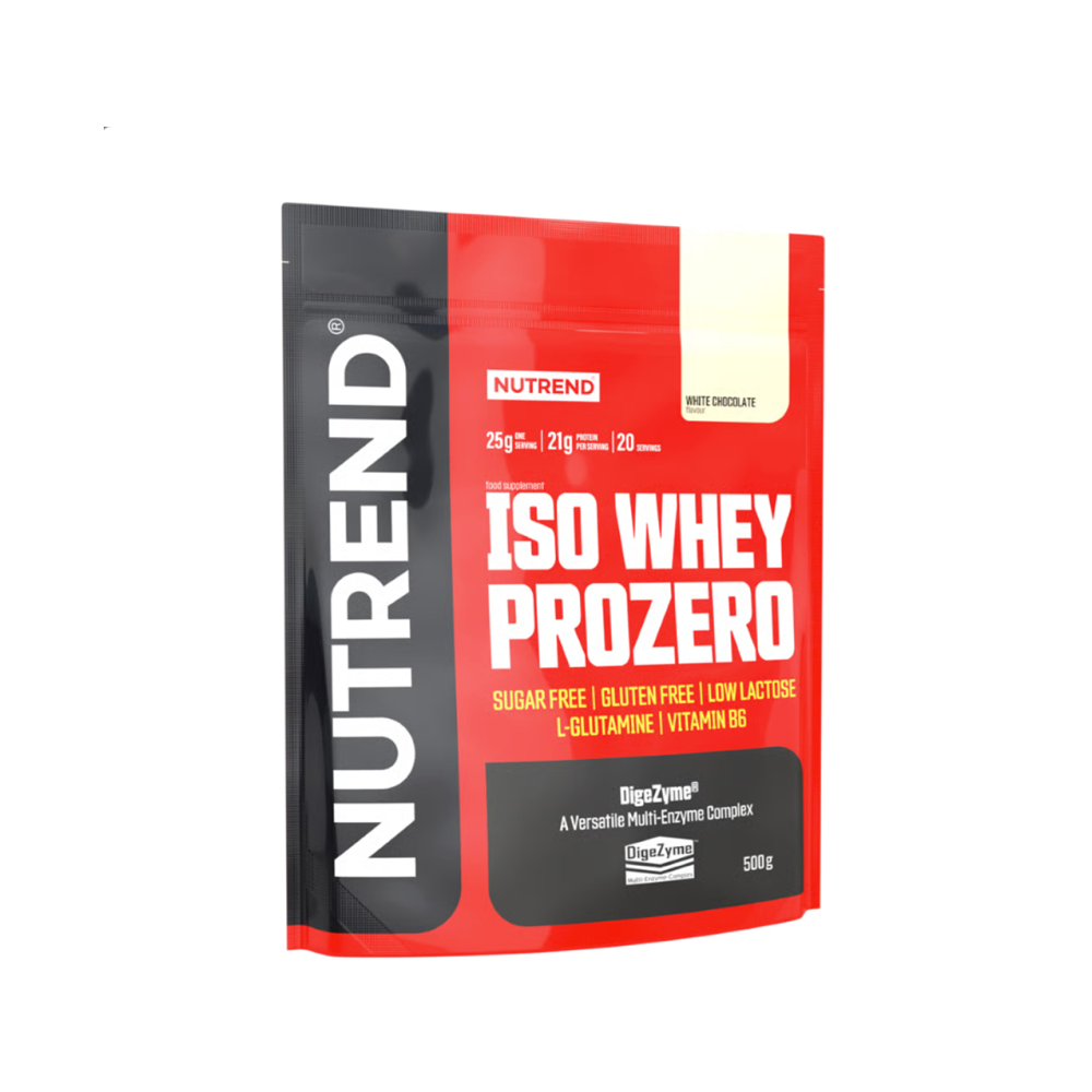 NUTREND Iso Whey PROZERO 500 g – prémiový syrovátkový izolát s vysokým podílem bílkovin a přirozenými BCAA, bez přidaného cukru a bez lepku pro čistou regeneraci.