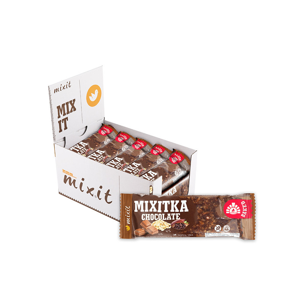 Dostali jsme vypečený nápad – upéct Mixitku plnou čokolády. A tak se zrodila ovesná tyčinka bez lepku s 12 % lahodných čokoládových kousků. Bohatou recepturu doplňuje bambucké máslo, quinoa, kvalitní kakao a k oslazení jsme použili agávový sirup.