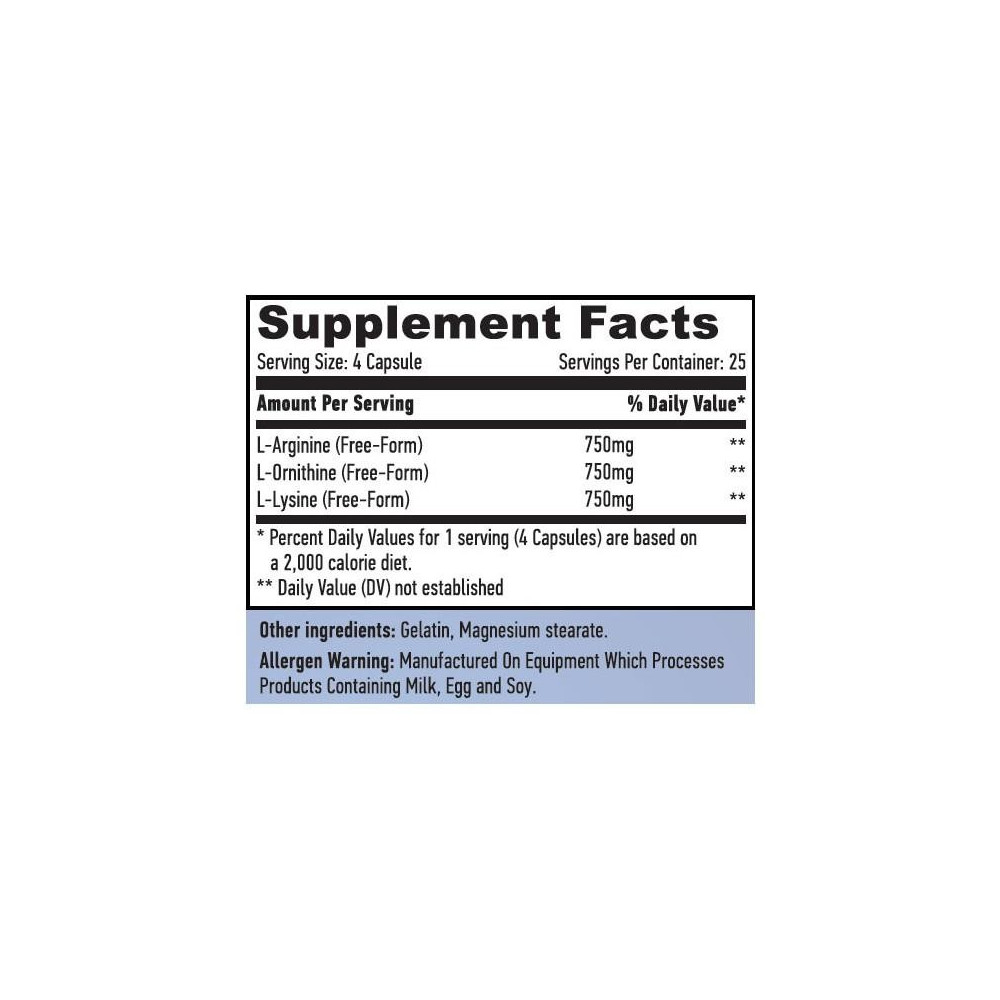 L-arginin, L-ornitin a L-lysin obsahuje kombinaci aminokyselin argininu a lysinu, které stimulují produkci růstového hormonu. Složení výrobku je ještě obohaceno o aminokyselinu ornitin, která zvyšuje účinek dříve zméněných dvou aminokyselin. Arginin podporuje dělení buněk, neutralizuje škodlivé účinky volných radikálů a zvyšuje velikost svalové hmoty. Tato aminokyselina podporuje imunitní systém a sexuální funkci a také zlepšuje náladu.
