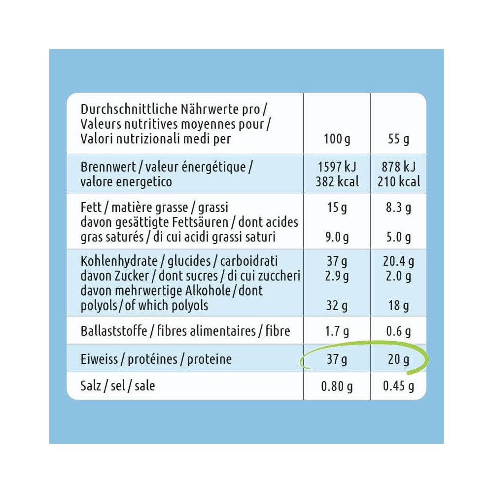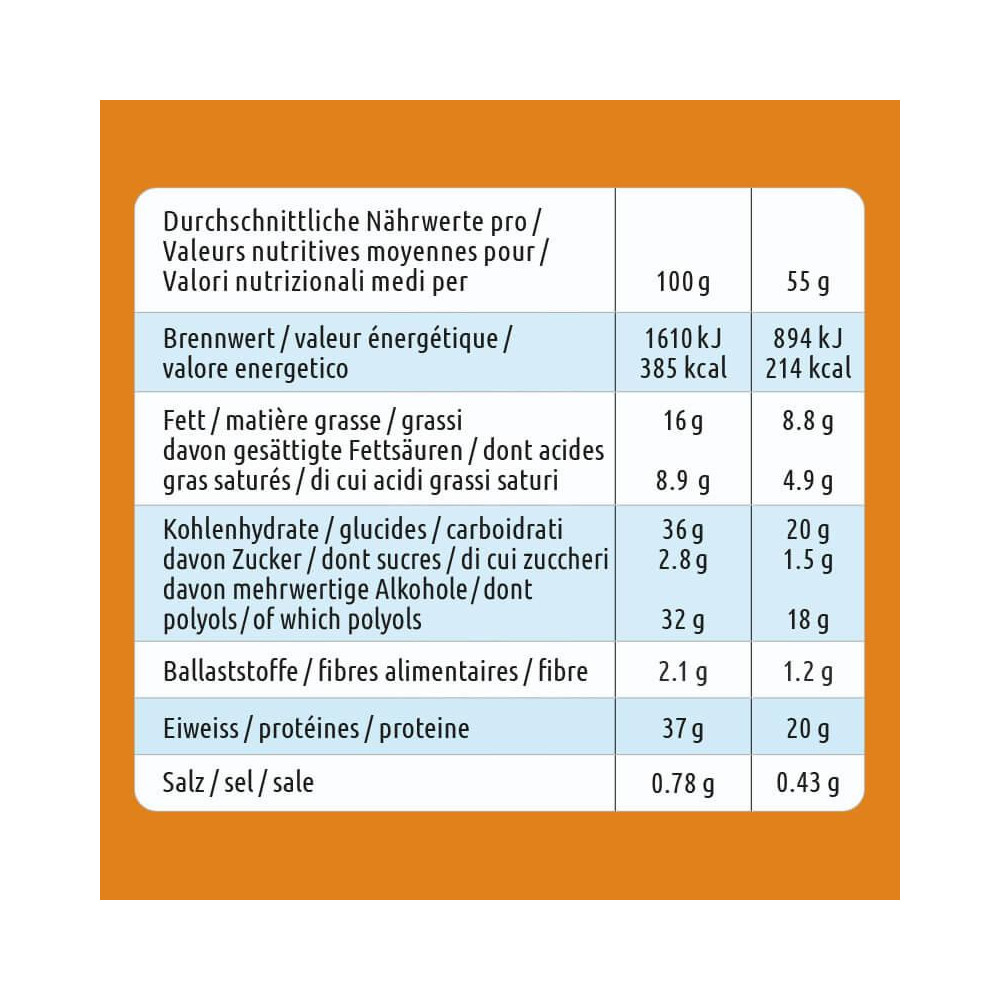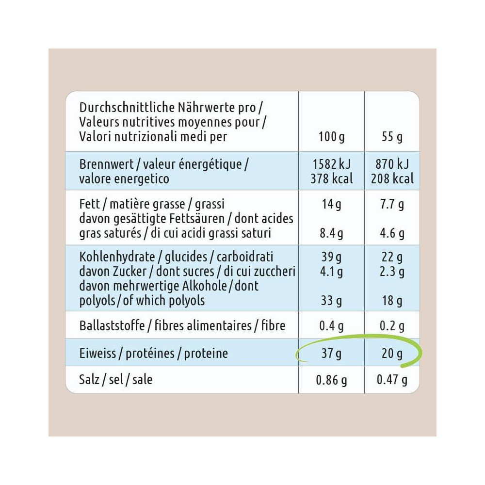 Křupavé na povrchu, měkké uvnitř, obalené v té nejlepší čokoládě - exploze chuťových pohárků je zaručena. To ale není všechno. Tato hříšně chutnající tyčinka obsahuje neuvěřitelných 20 gramů bílkovin a neobsahuje žádný přidaný cukr.