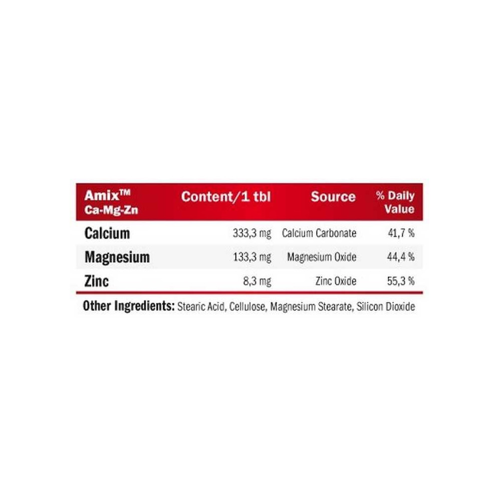 AMIX Calcium + Magnesium + ZinekHořčík, vápník, zinek pro zdravé kosti a zuby! Tablety s obsahem základních minerálů (vápník, hořčík a zinek). Vápník přispívá k normálnímu energetickému metabolismu, k normální činnosti svalů a je potřebný pro udržení normálního stavu kostí a zubů. Hořčík přispívá ke snížení míry únavy a vyčerpání, k normálnímu energetickému metabolismu a k normální činnosti svalů. Zinek přispívá k udržení normálního stavu kostí, vlasů a nehtů a k ochraně buněk před oxidativním stresem. Nutriční informace