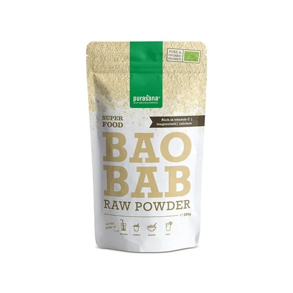 Purasana Baobab Powder BIO 200 gBIO baobab v prášku s vysokým obsahem vitaminu C, vlákniny a přirozeně cenných živin pro každodenní podporu imunity, vitality a vyváženého jídelníčku. Objevte sílu afrického stromu života v čisté BIO kvalitě. Purasana Baobab Powder BIO je 100% přírodní superpotravina získaná z ekologicky pěstovaných plodů baobabu, které jsou šetrně zpracovány tak, aby si zachovaly maximum svých přirozených nutričních hodnot. Baobab je ceněný zejména pro svůj vysoký obsah vitaminu C, který přispívá k normální funkci imunitního systému, a také pro obsah vlákniny a antioxidantů. Díky jemně ovocné chuti se skvěle hodí do smoothie, jogurtu, kaší i domácích funkčních receptů. Proč zařadit BIO baobab do jídelníčku?