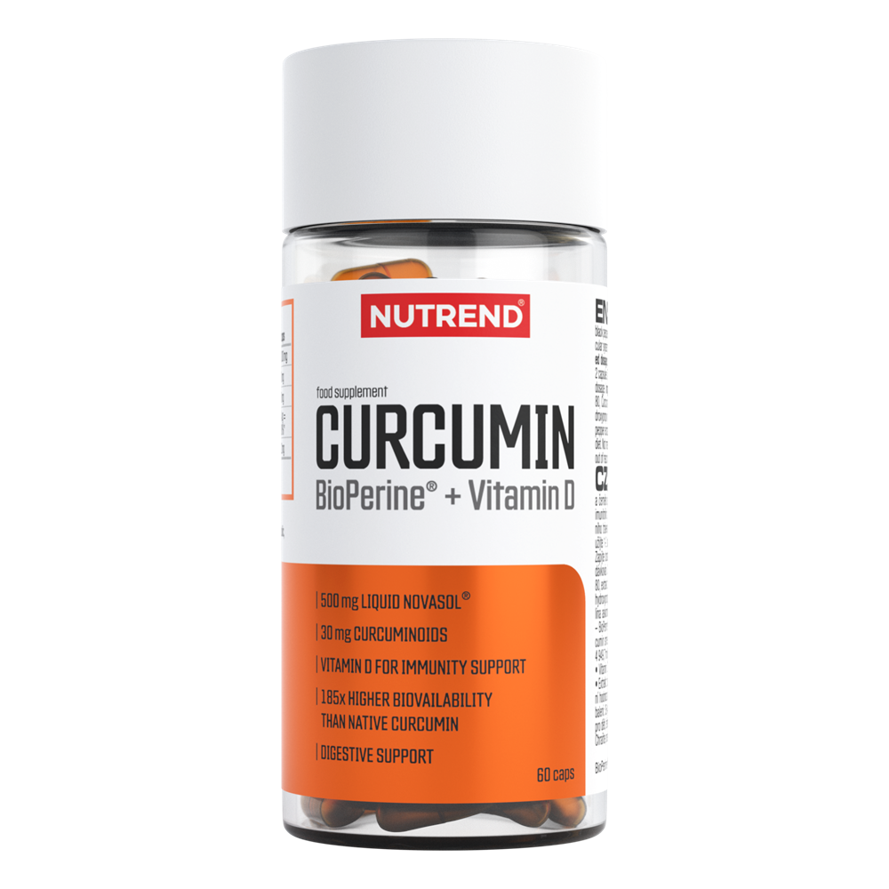 CURCUMIN + BIOPERINE + VITAMIN DNový produkt od společnosti NUTREND patří k absolutní špičce ve své kategorii. Účinky kurkuminu jsou v této směsi podpořeny BioPerine® a vitamínem D. Díky unikátním technologiím a receptuře je výtažek kurkuminoidů až 185× vstřebatelnější než běžný kurkumin v přírodní formě a 2 kapsle produktu mohou být až 27× účinnější než běžné tablety. Kurkumin je známý pro své antioxidační vlastnosti, spojované také s podporou komfortu při zánětlivých procesech a se správným trávením. V rámci režimu je často vyhledávaný i jako součást „odlehčovacích“ a detoxikačních plánů. Díky vitamínu D navíc přispívá k normální funkci imunitního systému a k udržení normálního stavu kostí a zubů.