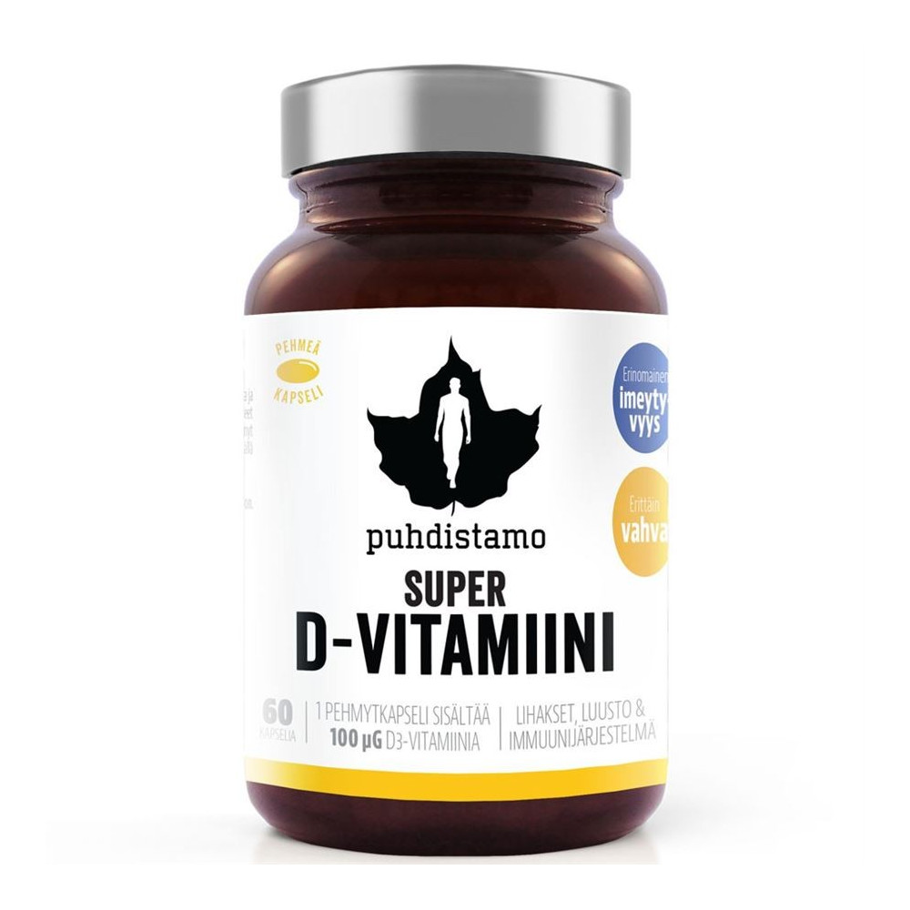 Puhdistamo Super Vitamin D3 4000 IU (100 µg) – čistá extra silná dávka D3 v kapsli z přírodních zdrojů (tresčí olej + lanolin) pro imunitu, kosti a svaly.