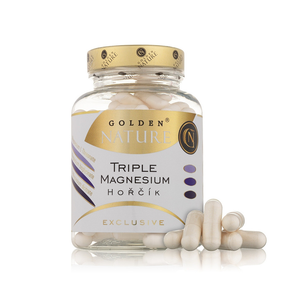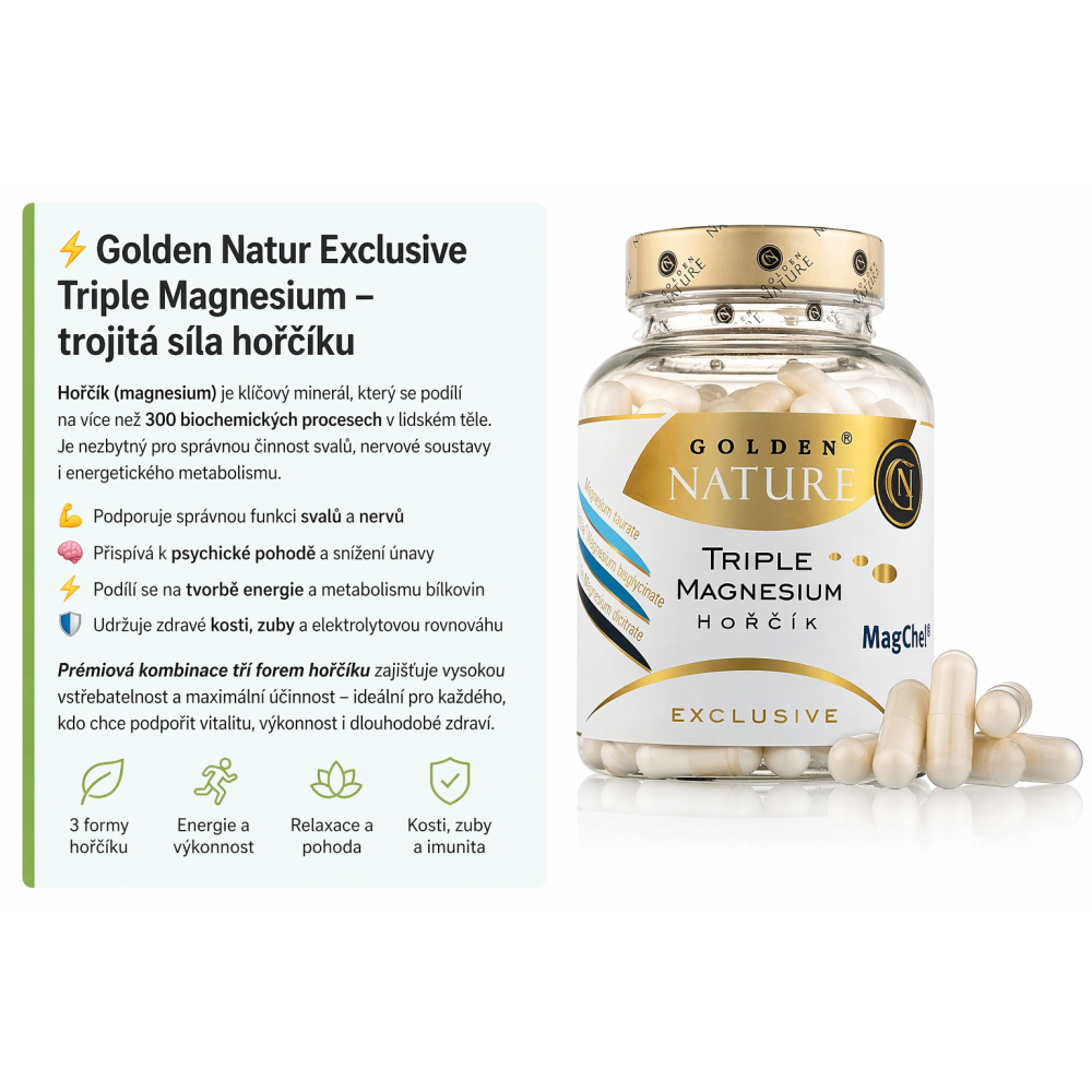 Golden Nature Exclusive Triple Magnesium přináší trojitou kombinaci nejúčinnějších organických forem hořčíku v síle 600 mg na kapsli (86 mg elementárního hořčíku). Tento prémiový doplněk stravy podporuje nejen fyzickou výkonnost, ale i psychickou pohodu a kvalitní spánek.