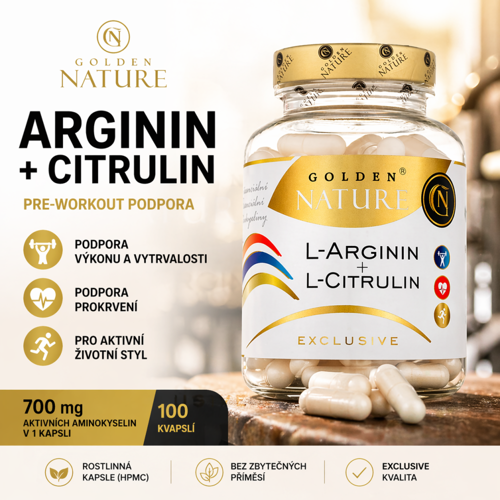 K čemu je Arginin + Citrulin?Golden Nature Exclusive Arginin + Citrulin je doplněk stravy s kombinací dvou aminokyselin, které sportovci často zařazují pro podporu prokrvení, tréninkového „drive“ a pocitu „pumpy“. Díky kapslím se snadno dávkuje a hodí se před trénink i v období vyšší zátěže. Golden Nature Exclusive Arginin + Citrulin – síla aminokyselin pro výkon a regeneraciSynergická kombinace L-argininu a L-citrulinu v každé kapsli přináší oblíbený „pre-workout“ základ pro sportovní režim. V jedné kapsli najdete 700 mg aktivních aminokyselin (L-Arginin HCl + L-Citrulline Malate 2:1) – bez zbytečných plniv, v praktické rostlinné HPMC tobolce. ✨ Klíčové benefity