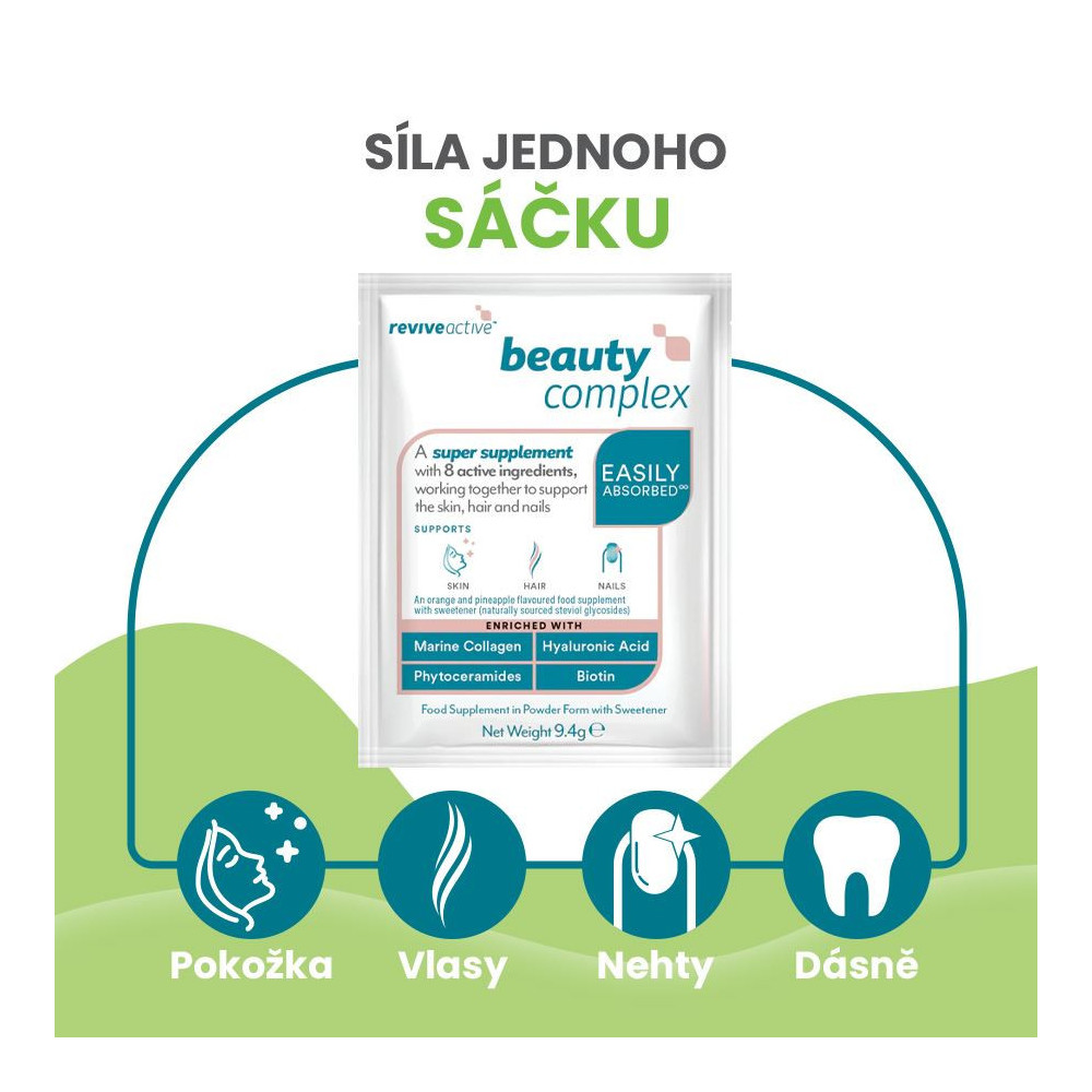 Beauty Complex je speciálně navržený pro ženy, je vhodný pro všechny věkové skupiny. Beauty Complex není jen další multivitamín, jde o superdoplněk s množstvím účinných látek, které je pro multivitamíny zcela netypické. Beauty Complex se od jiných produktů odlišuje unikátní a velmi silnou kombinací unikátních biaoktivních složek jako je kyselina hyaluronová, kolagenní peptidy, fytoceramidy kombinovaných s vitamínů a minerálů. Prášek je snadno rozmíchatelný ve vodě nebo libovolném nápoji. Jeden sáček dodá potřebné mikronutrienty pro celý den. Doplněk je vhodný pro vegany, je kompletně bez lepku a je slazený steviol-glykosidy.