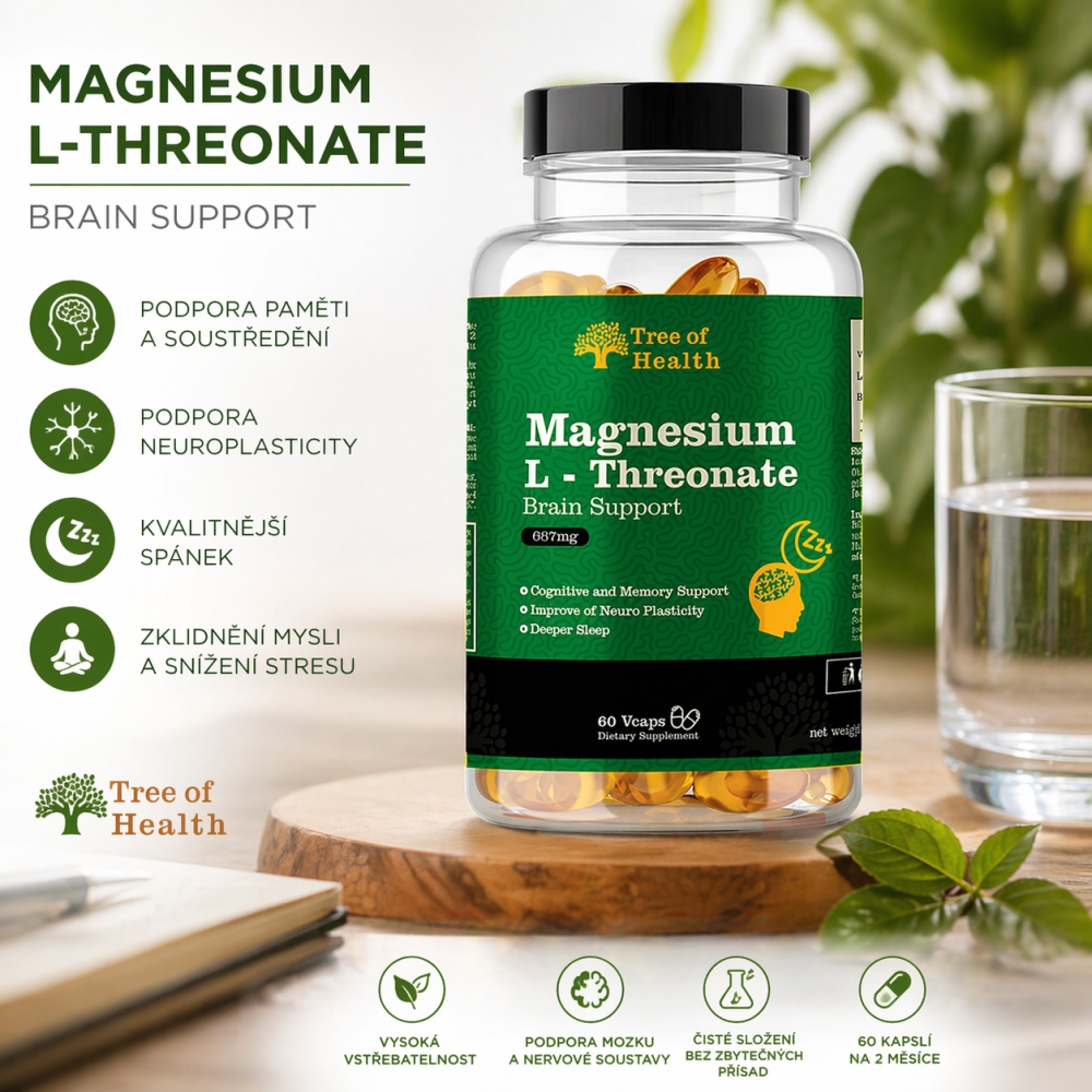 Produkt Tree of Health Magnesium L-Threonate 667 mg nabízí čisté složení, veganské kapsle a důraz na kvalitu, která odpovídá současným nárokům na prémiovou suplementaci.