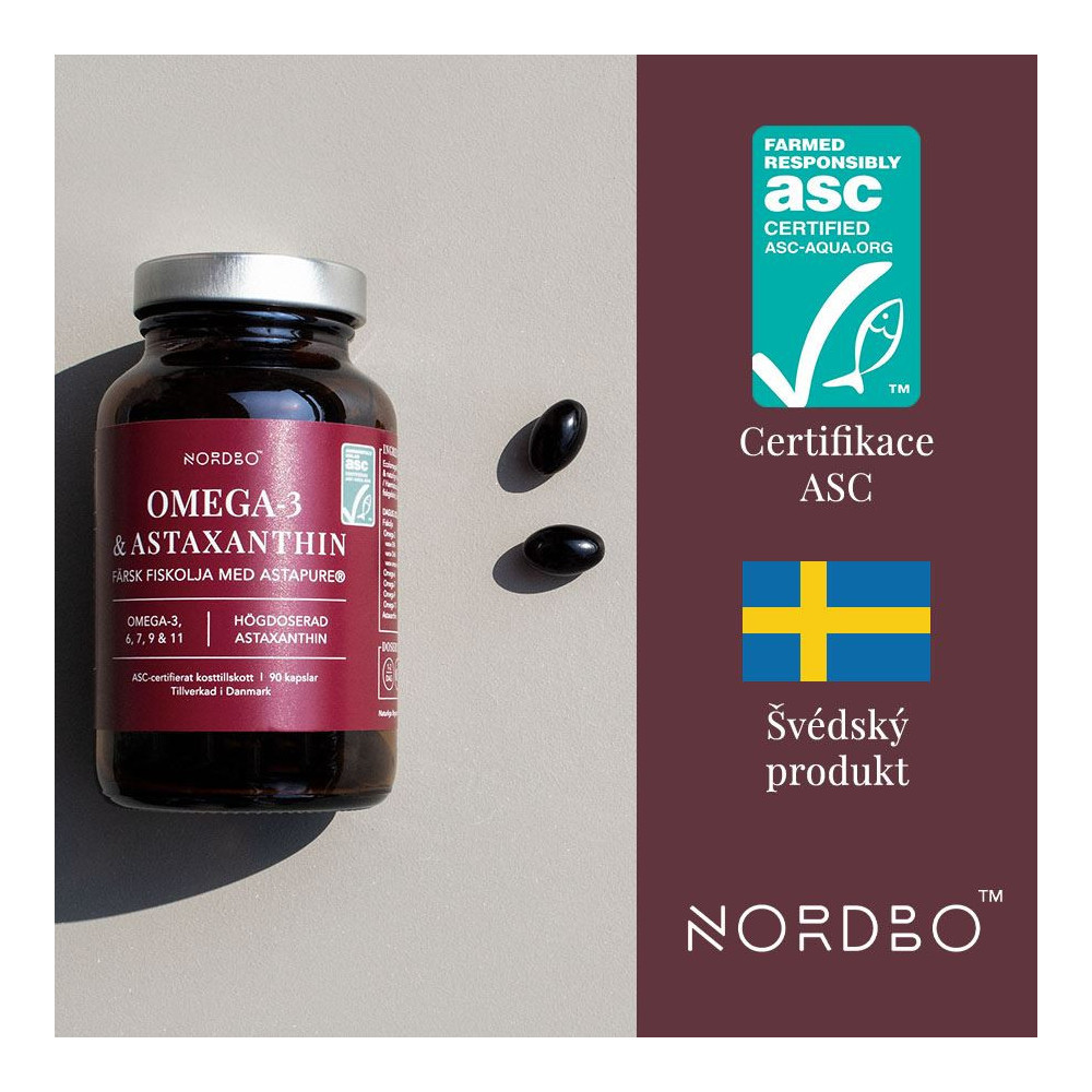 Nordbo Omega 3 & Astaxanthin je skandinávský rybí olej s certifikací ASC (odpovědný chov/zdroj) v nativní kvalitě Ecolomega®, posílený o AstaPure® astaxanthin z červené řasy. Ideální volba pro každodenní režim, když chceš čisté omega kyseliny a antioxidant v jedné kapsli – bez zbytečných kompromisů. |