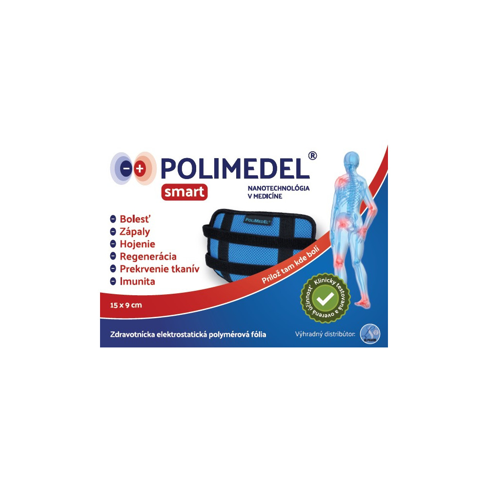 POLIMEDEL je zdravotnický prostředek nové generace, který pracuje na principu elektrostatického působení. Díky patentované nanotechnologii je fólie nabita trvalým záporným elektrostatickým nábojem, který aktivuje přirozené regenerační procesy v těle. Fólie zlepšuje mikrocirkulaci, snižuje otoky, tlumí bolest a urychluje hojení bez vedlejších účinků.